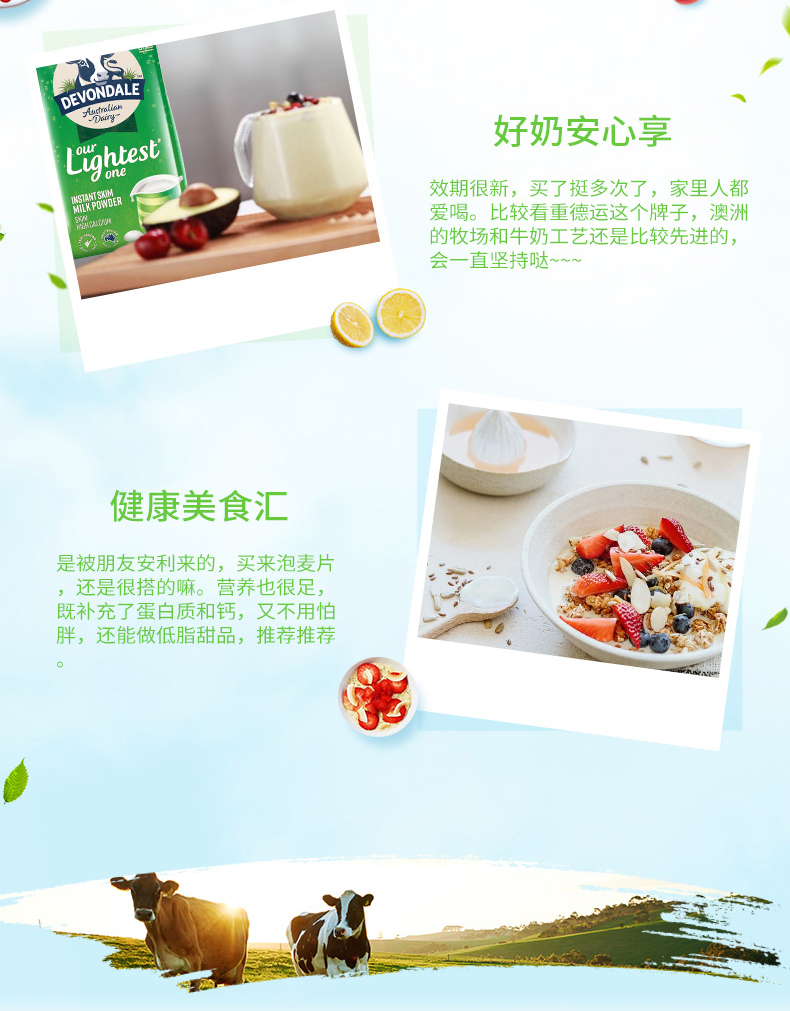 德运 脱脂奶粉,澳大利亚原装进口,源源自生态牧场,原产地溯源,先进脱脂工艺严格管控,脂肪含量直降约96%,能量直降约28%,醇正奶香,脱脂不脱味,瘦身好搭档。