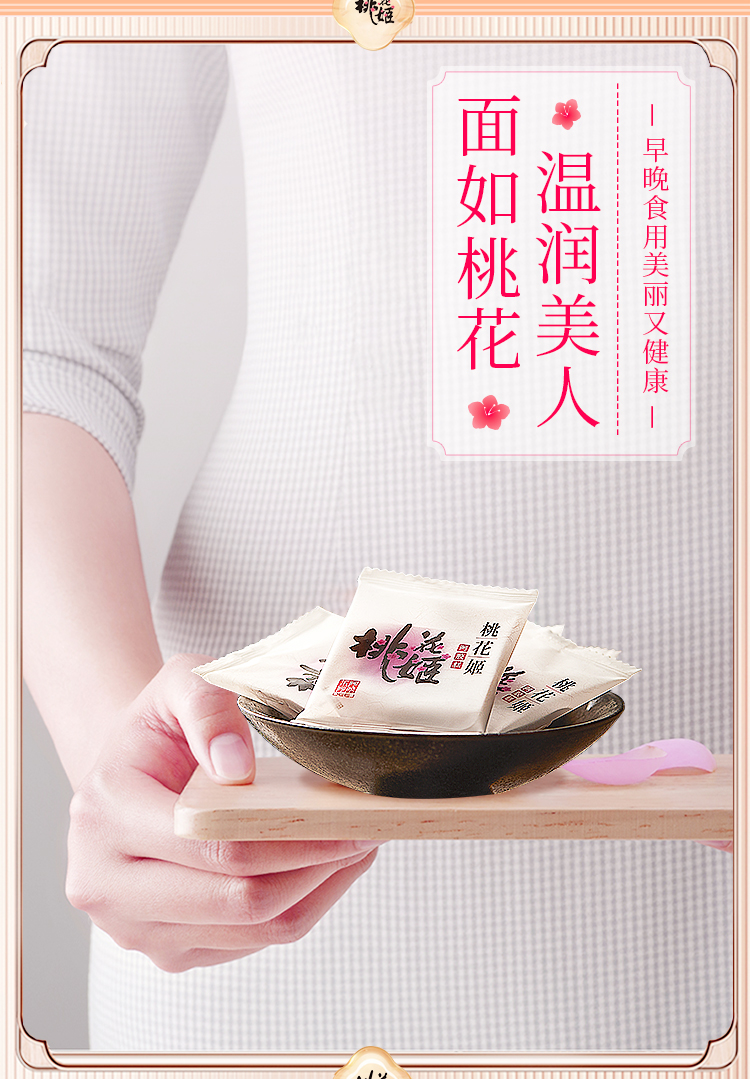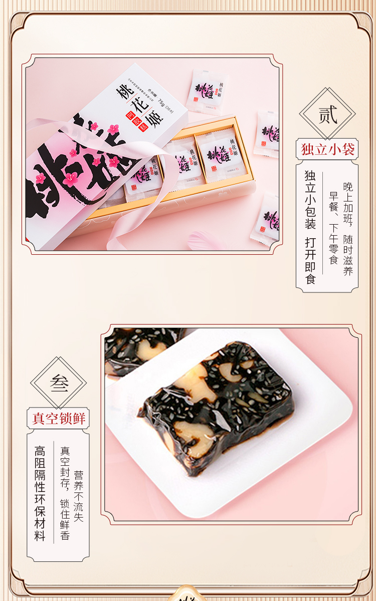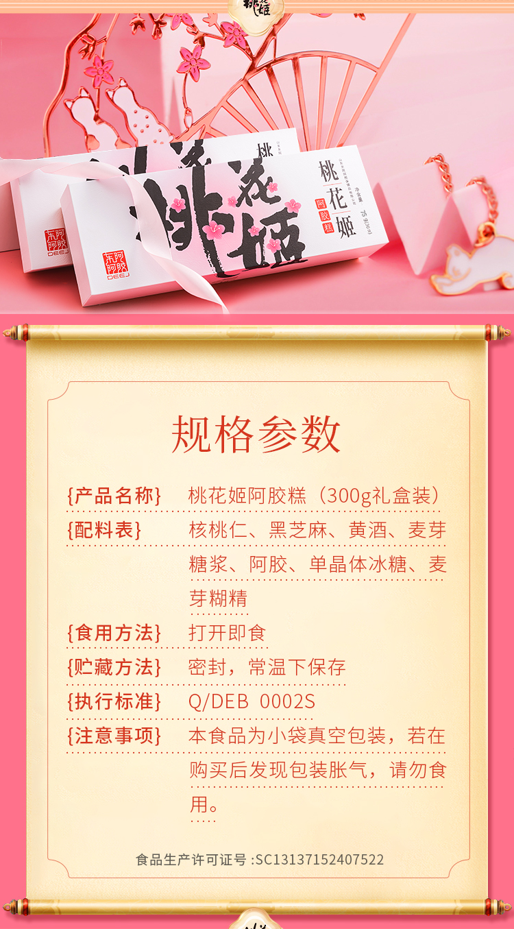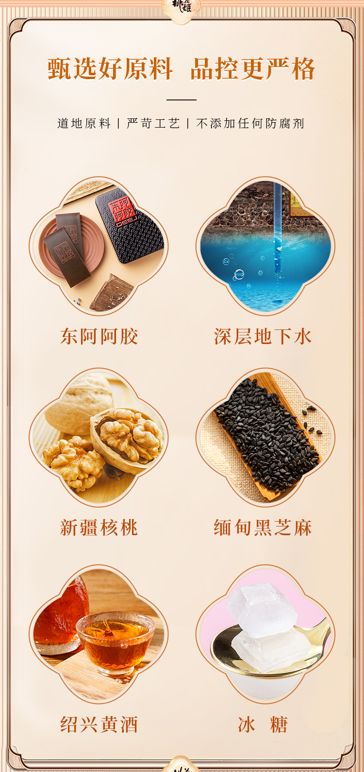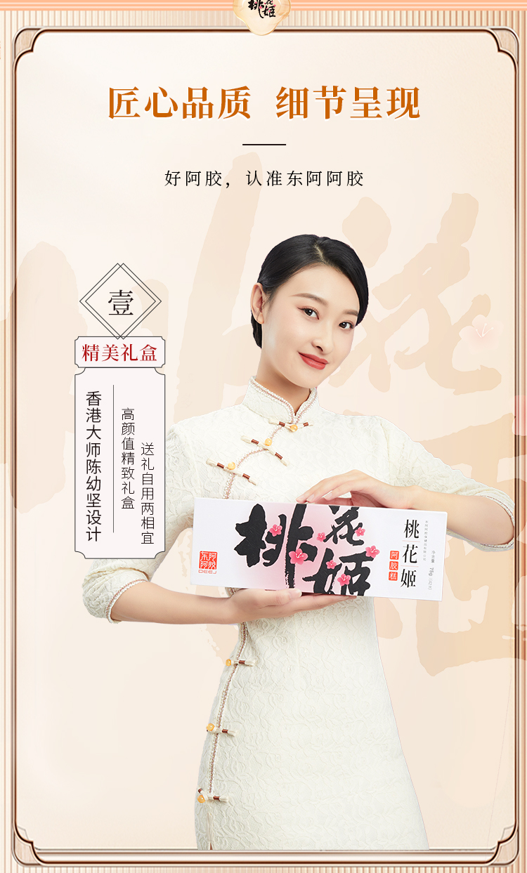 桃花姬阿胶糕由上等东阿阿胶、黑芝麻、绍酒、核桃仁、冰糖等配制而成,富含蛋白质和多种氨基酸、微量元素,营养丰富,方便可口。通过加入核桃、黑芝麻等原料,核桃的香脆和芝麻的浓香渗入琥珀色的阿胶中,入口带有淡淡清香。主要用于滋阴养血、润燥、美容养颜、增强免疫力。