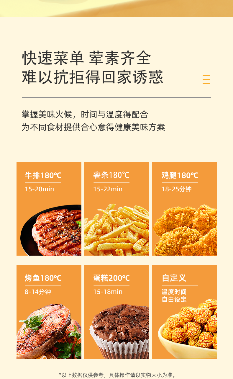 空气炸锅适合烹饪各种肉类、薯条、蛋挞(某宝上可直接买坯子 蛋液)。也可加热买来的外卖熟食,如 披萨、香肠、猪蹄、面包片类之类的,还是很方便的,也是厨房中实用比较高的厨具。