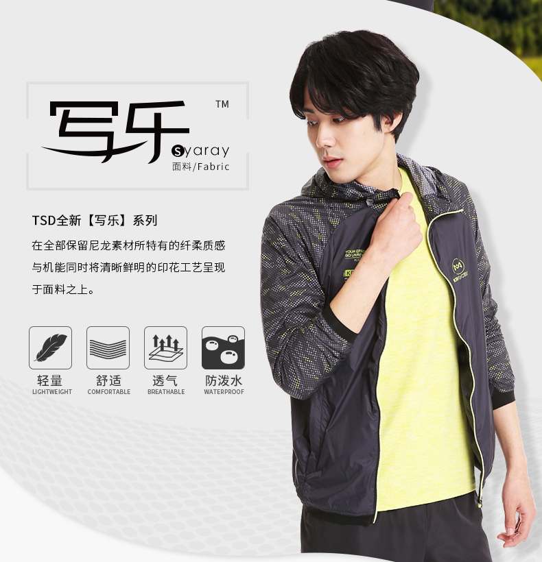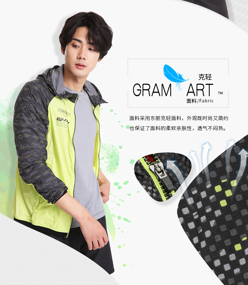 在款式上,一体连帽设计,腋下有专门的透气孔,弹力松紧袖口和下摆防止漏风,YKK拉链,衣面上是清晰鲜明的印花。
