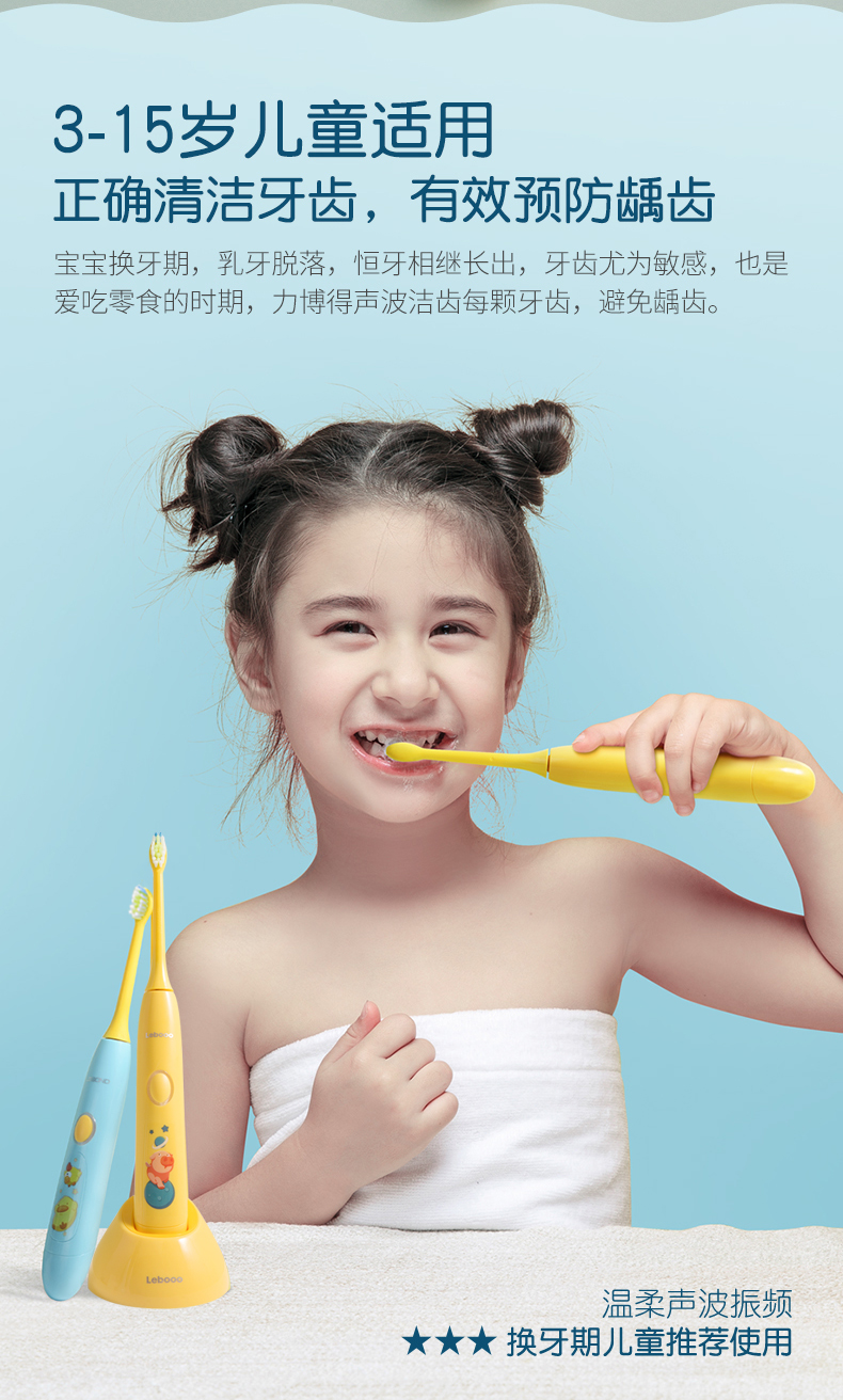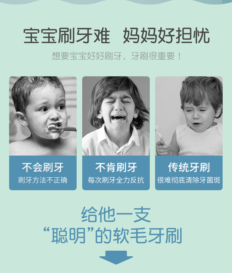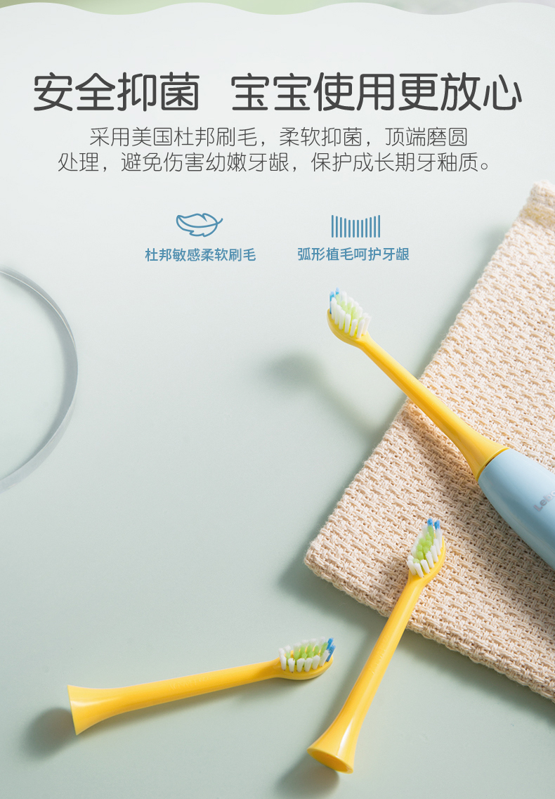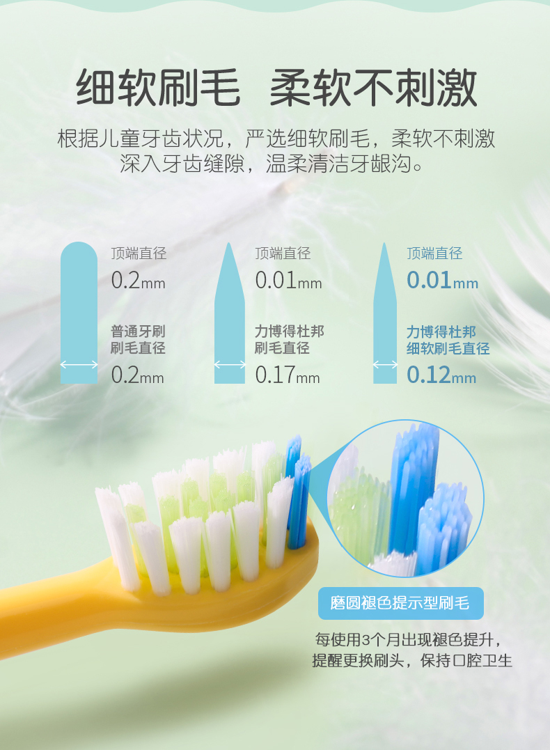 刷头采用0.12mm美国杜邦细软刷毛,柔软抑菌,顶部磨圆设计,柔软不刺激,避免伤害宝宝娇嫩牙龈,深入牙齿缝隙,温柔清洁牙垢;刷毛褪色提示,月3个月出现褪色,提醒更换,保持卫生使用更安心。