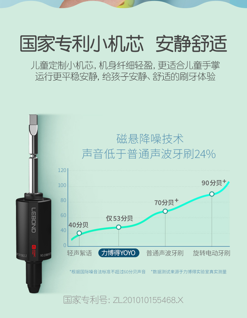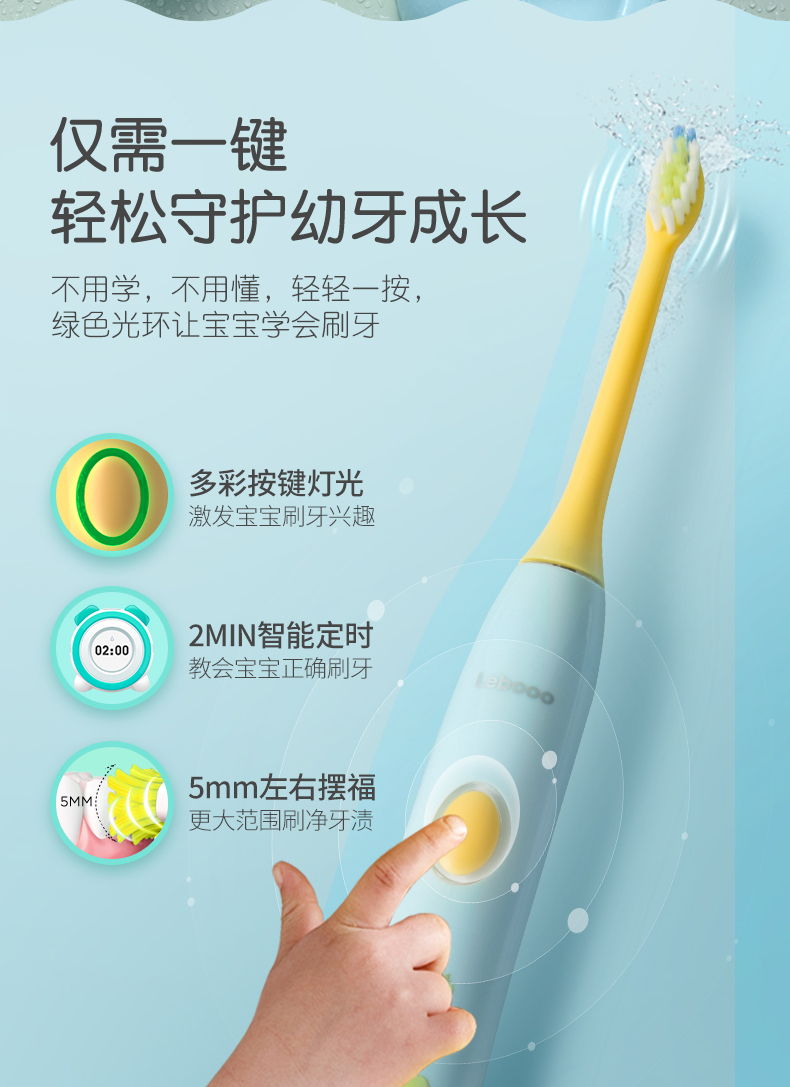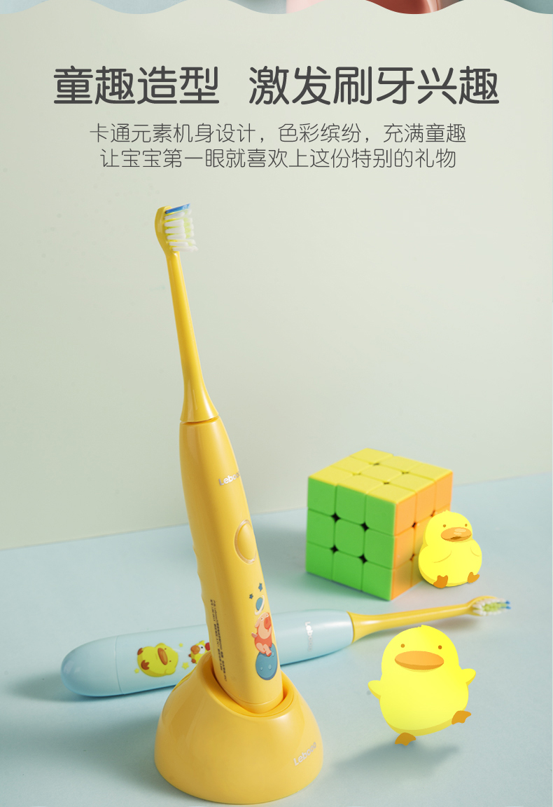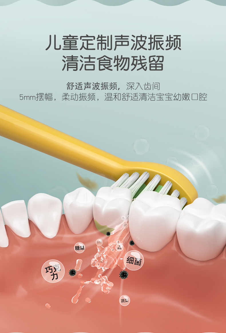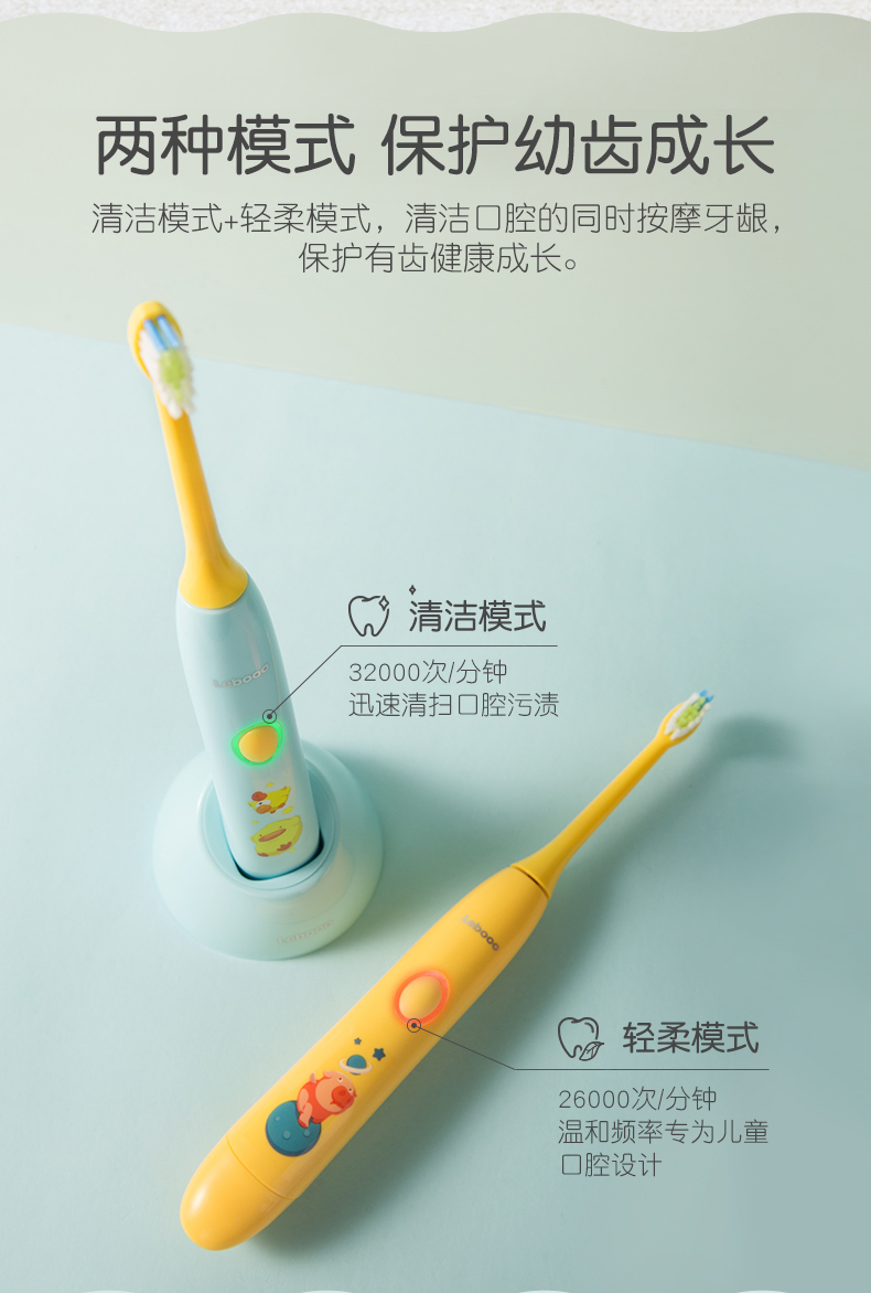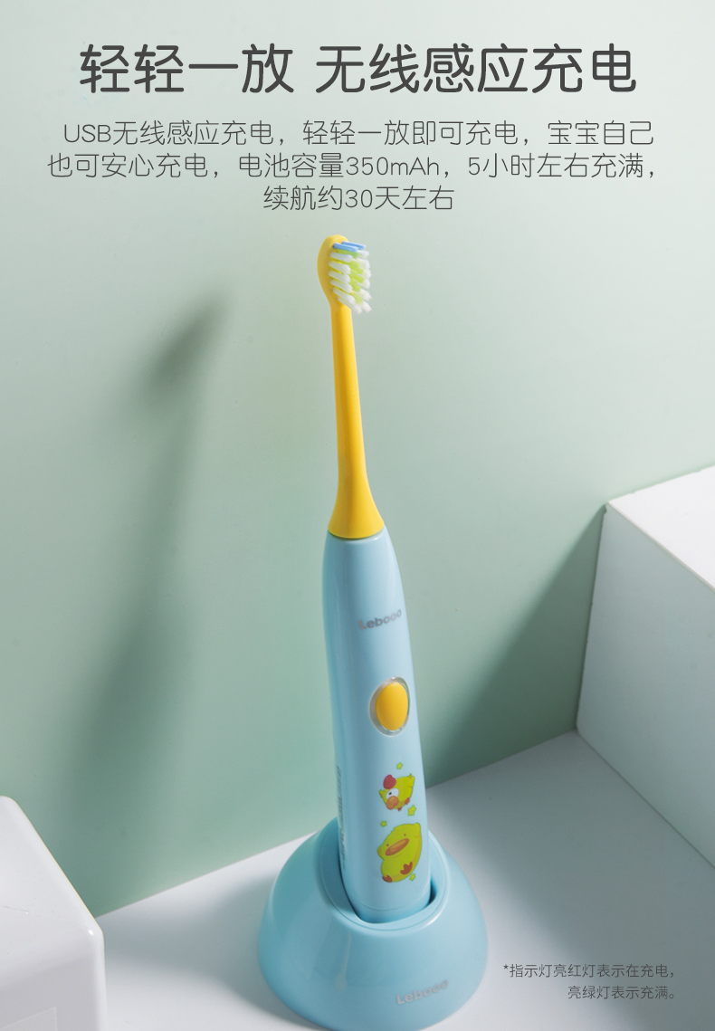 这款儿童电动牙刷,采用国家专利磁悬浮小机芯,机身纤细更适合宝宝掌握,有清洁模式32000次/分、轻柔模式26000次/分 2种模式,2分钟智能定时每30秒提示,5mm振幅温和舒适更适合宝宝幼嫩口腔,USB无线感应充电,轻轻-放即可充电,宝宝自己也可安心充电,电池容量350mAh, 5小时左右充满,续航约30天左右,机身IPX7级防水,可直接冲洗。