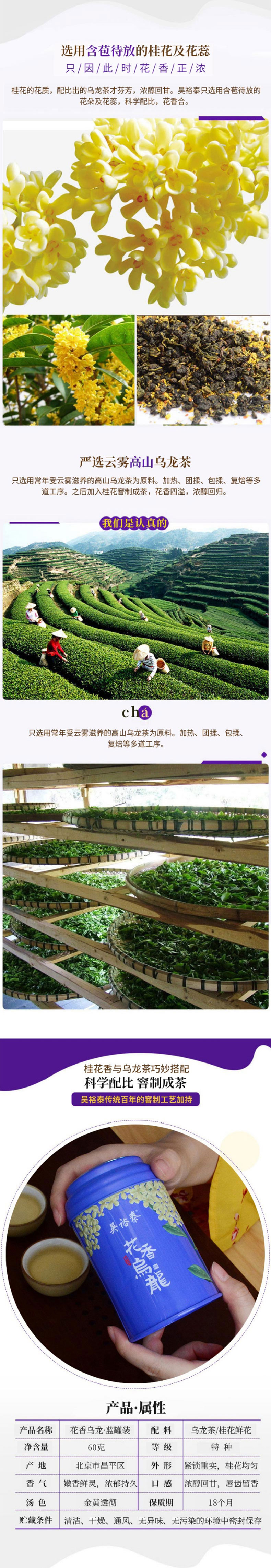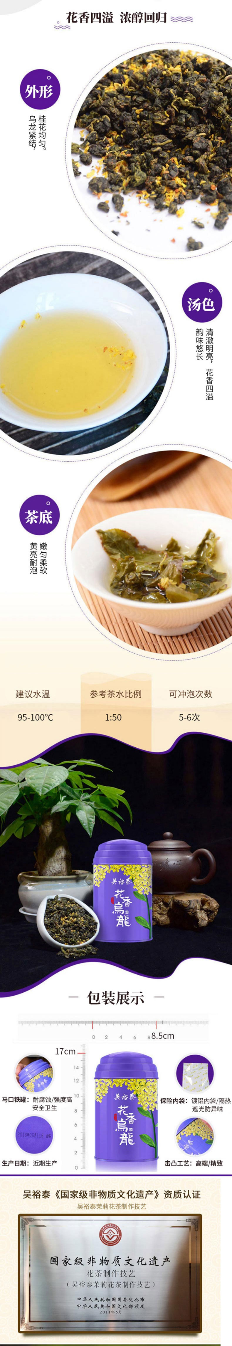 这款吴裕泰 2021新茶 特种桂花乌龙茶,规格: 60g,选用含苞待放的桂花花朵和花蕊,常年受云雾滋养的高山乌龙茶为原料,经加热、团揉、包揉、复焙等多道工序,科学配比,吴裕泰传承百年的窖制工艺加持,制成这款花香四溢,浓醇回甘的好茶。乌龙紧结,桂花均匀,冲泡出的汤色清澈明亮,花香四溢,韵味悠长。