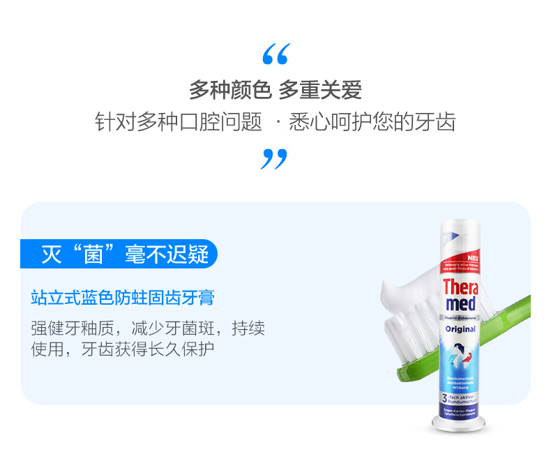 具有自然美白、防蛀固齿的功效,能在无漂白剂和无清洗颗粒的前提下柔和地清除牙齿上的杂色和污垢,使牙齿恢复自然美白,内含的活性氟组合成分能持久地保护牙齿,深受欧洲人喜爱。另外该款按压式的设计确保牙膏不残留,低泡膏体,开盖12个月用完即可。