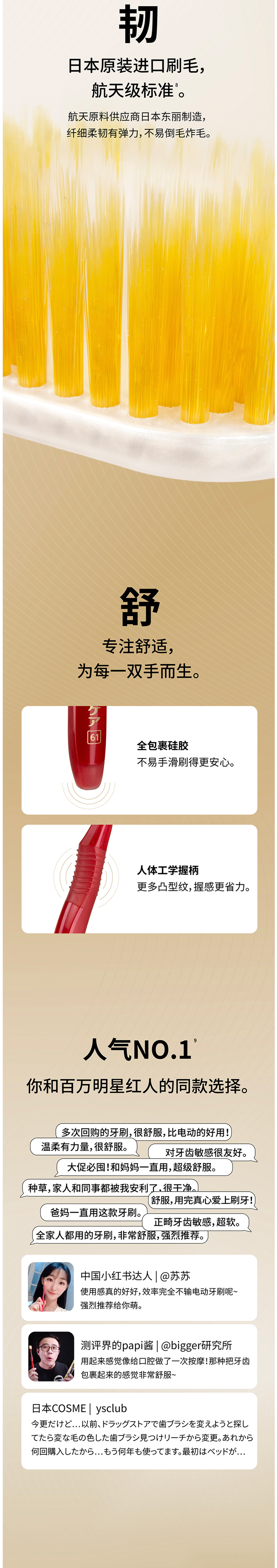 这款牙刷48孔大宽头设计,毛孔数是普通刷头的1.8倍,能大面积的覆盖上下牙齿和牙龈,双层不同柔软度的刷毛设计,柔与力兼施,清洁与按摩兼备,呵护娇嫩牙龈。同时也是平尖两种刷毛的组合,丝径20微米的「超纤细尖毛」,能深入清洁牙龈沟,「平切毛」能清洁齿面色渍和污垢。