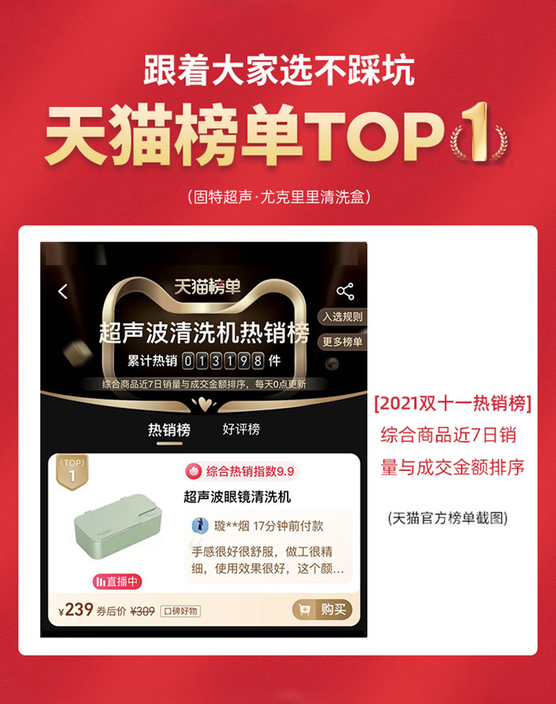 这款固特超声 超声波家用清洗机是宝岛眼镜官网推荐的超声波清洗机(下方有官网截图),适合清洗名贵眼镜、首饰等细小物品,不会造成划痕,而且清洗效果非常好,体验感最强的还是清洗隐形眼镜,将隐形眼镜+镜盒一起放入,超声波能通过护理液将隐形眼镜清洗的更干净,让你每天都有戴新的的感觉。