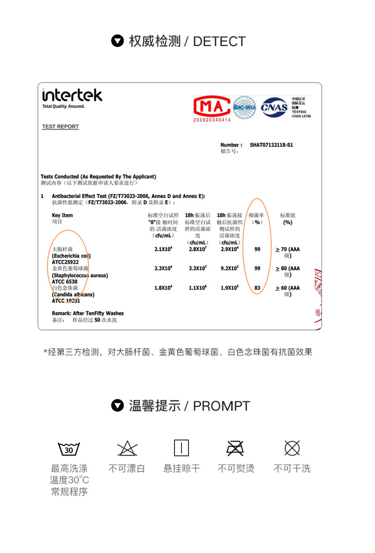 内档是AAA级有效抑菌,高于行业标准,大肠杆菌抑菌率99%、金黄色葡萄球菌抑菌率99%、白色念球菌抑菌率83%。
