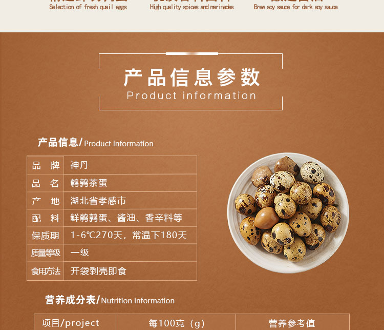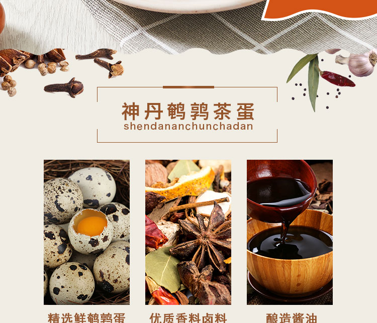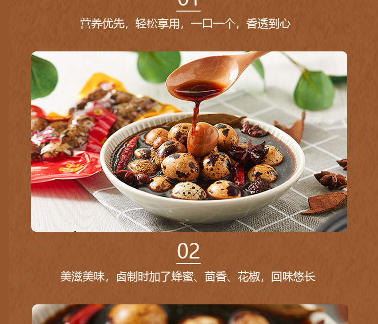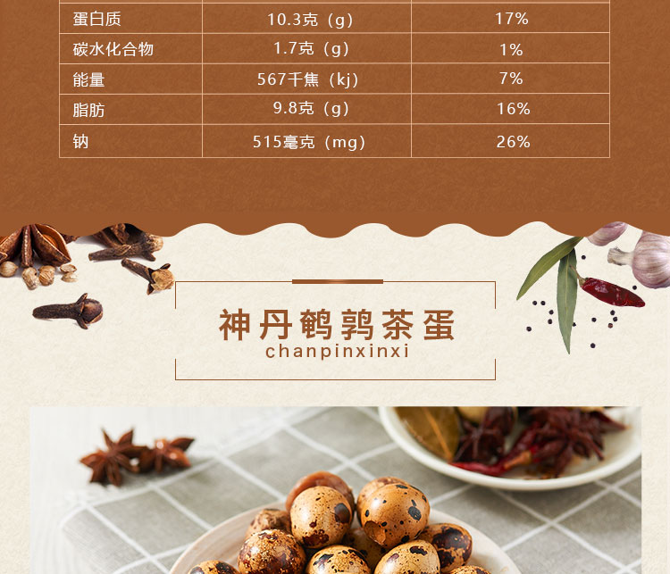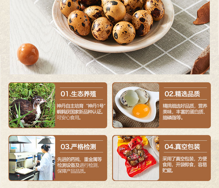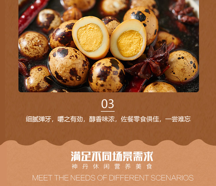 神丹 鹌鹑卤蛋 80枚 麻辣五香各5袋,精选鹌鹑蛋,国家新品种认证“神丹1号”、严格检测无药残、重金属等,品质有保障,优质香料卤料,卤制时加了蜂蜜、茴香、花椒等,卤蛋细腻弹牙,醇香味浓,好吃不腻,开袋即食,可做休闲零食,亦可做为下酒佳肴。