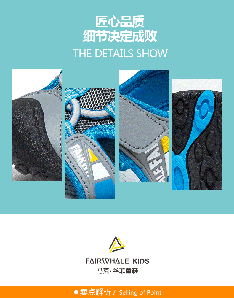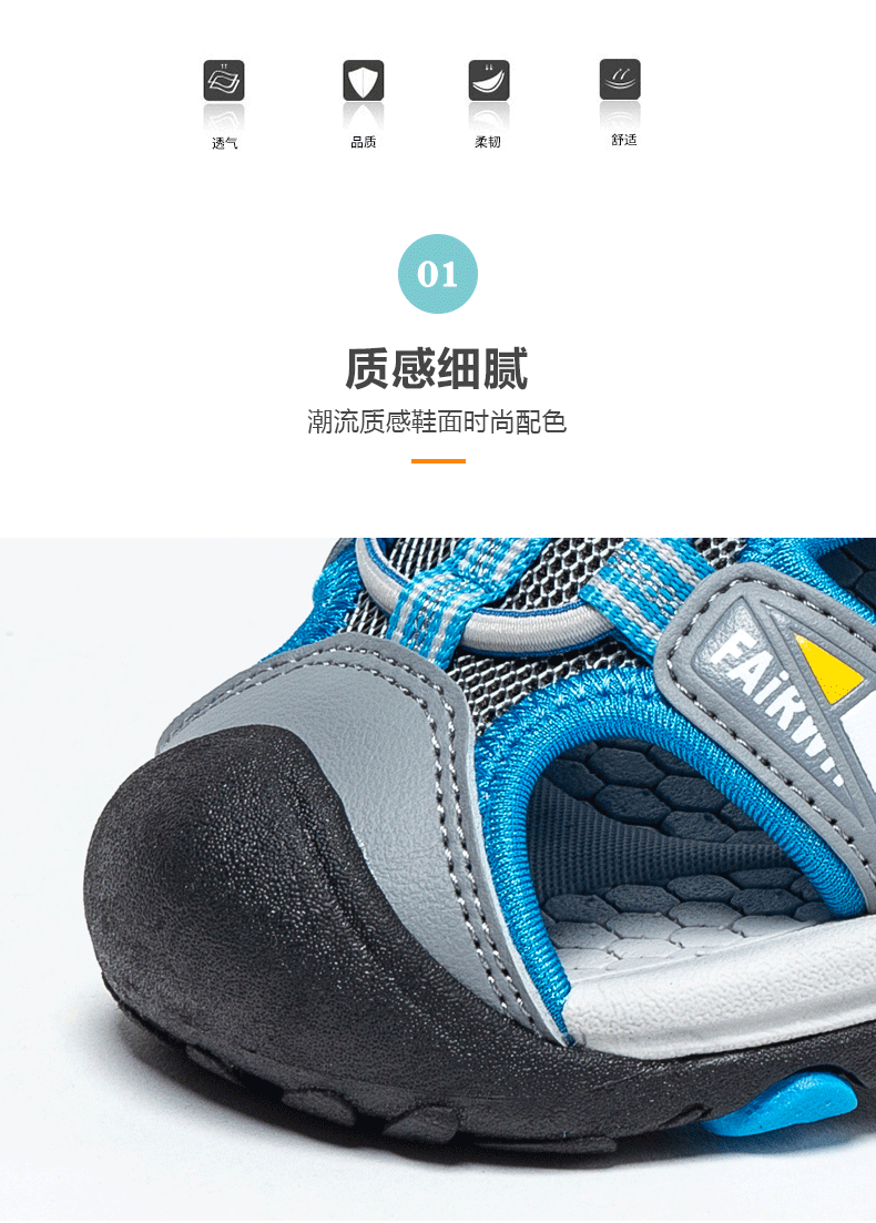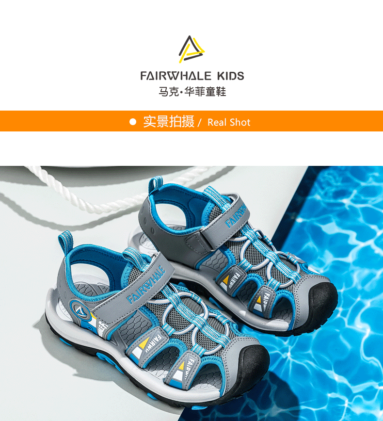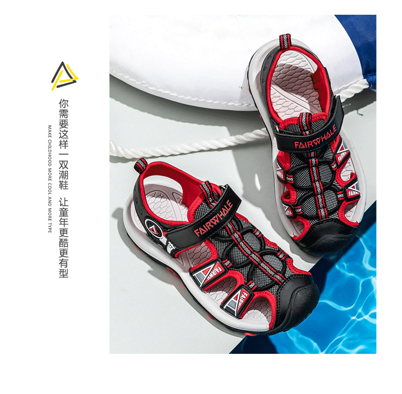 这款马克华菲儿童凉鞋,包头设计,防止宝宝脚丫受伤,时尚配色,潮流质感,简单魔术贴设计,可自由调节松紧,穿脱方便快捷,防滑鞋底,弹性减震,舒适行走。
