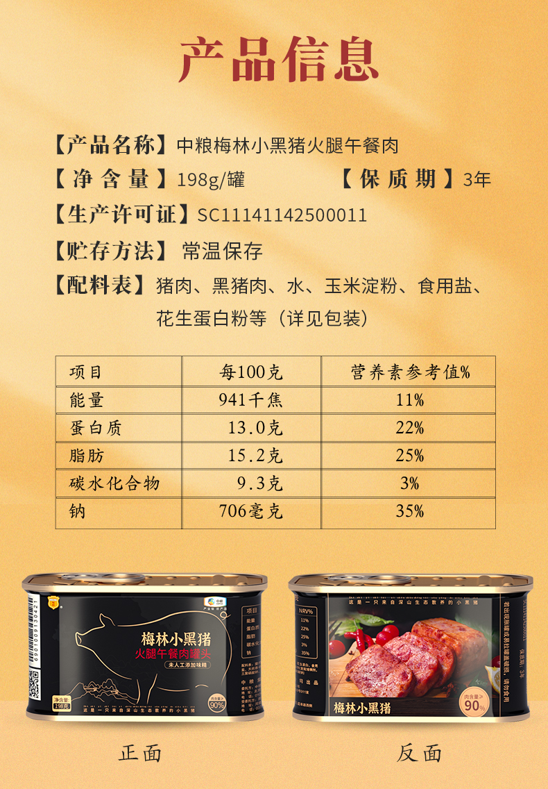 精选深山生态散养小黑猪,后腿肉制作肉含量>90%,看的见的猪肉颗粒,肉质Q弹,鲜香味美,降低盐量,高温处理,无菌真空封罐,无防腐剂,适合涮火锅、做三明治、炒菜等多样吃法。规格:198g*3罐