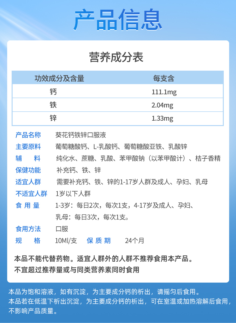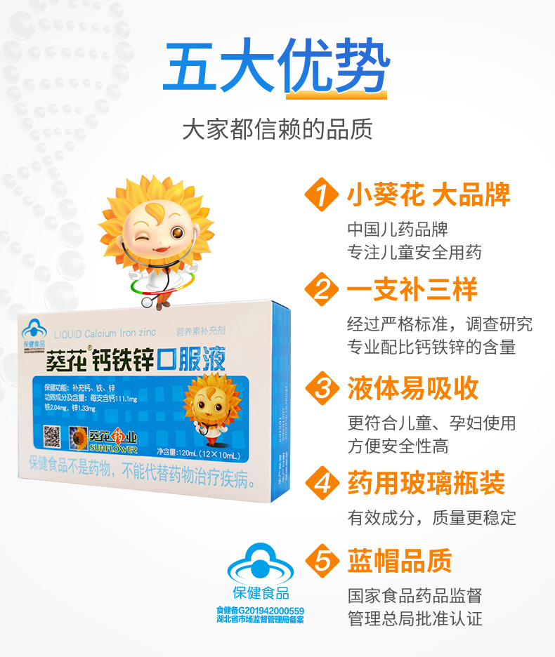 葵花品牌,线下药店都有卖,钙铁锌口服液儿童成长补钙,宝宝葡萄糖酸钙锌口溶液,一支补钙铁锌三样,每支含钙111.1mg、铁2.04mg、锌1.33mg液体钙易吸收。液体钙溶解度好,钙离子更易被吸收。适合儿童、孕妇、乳母等补充营养。旗舰店发货,品质靠谱。