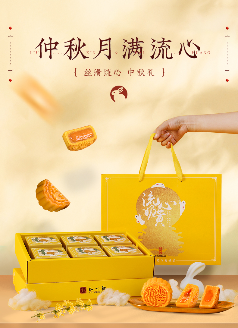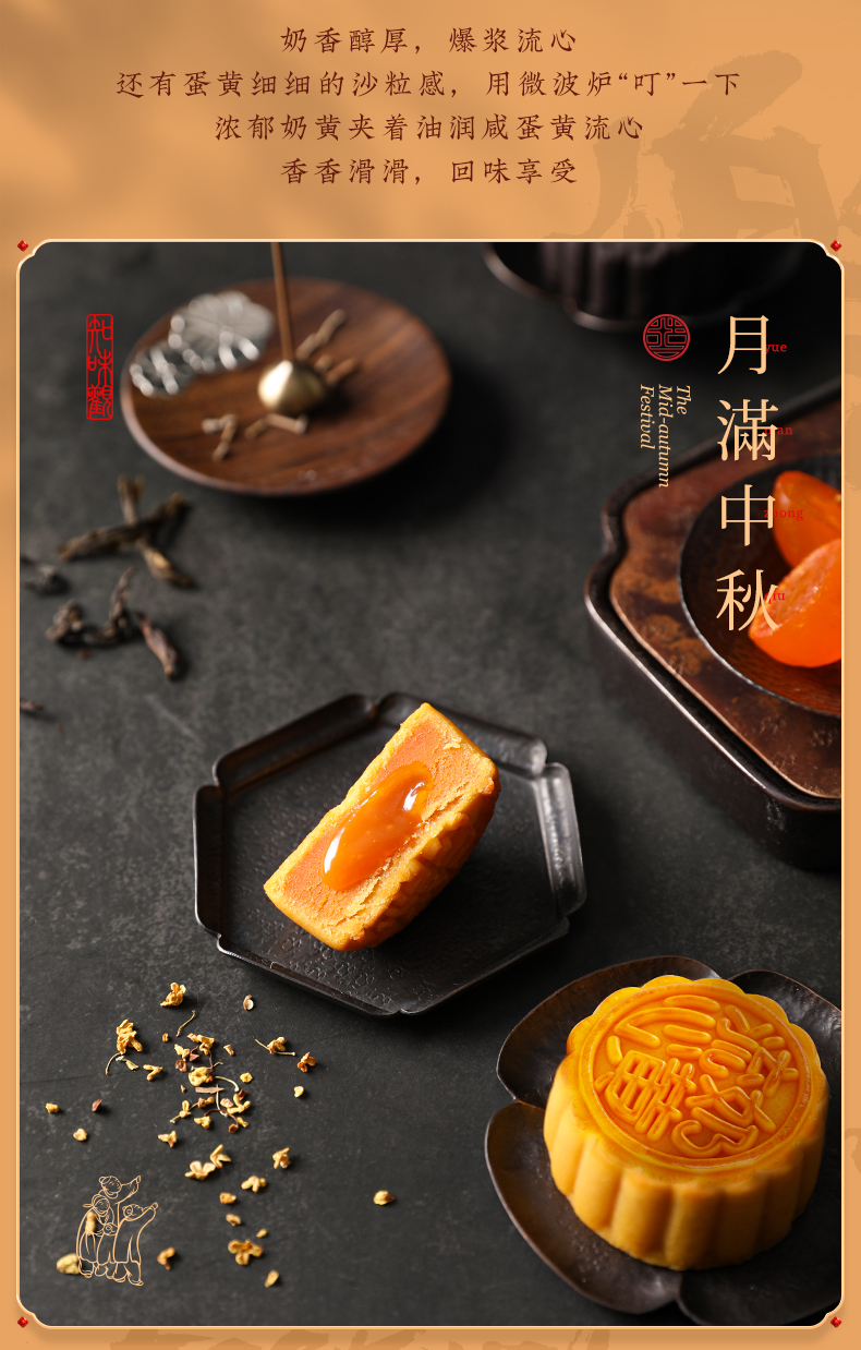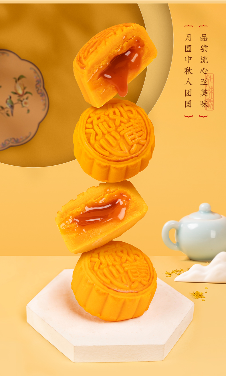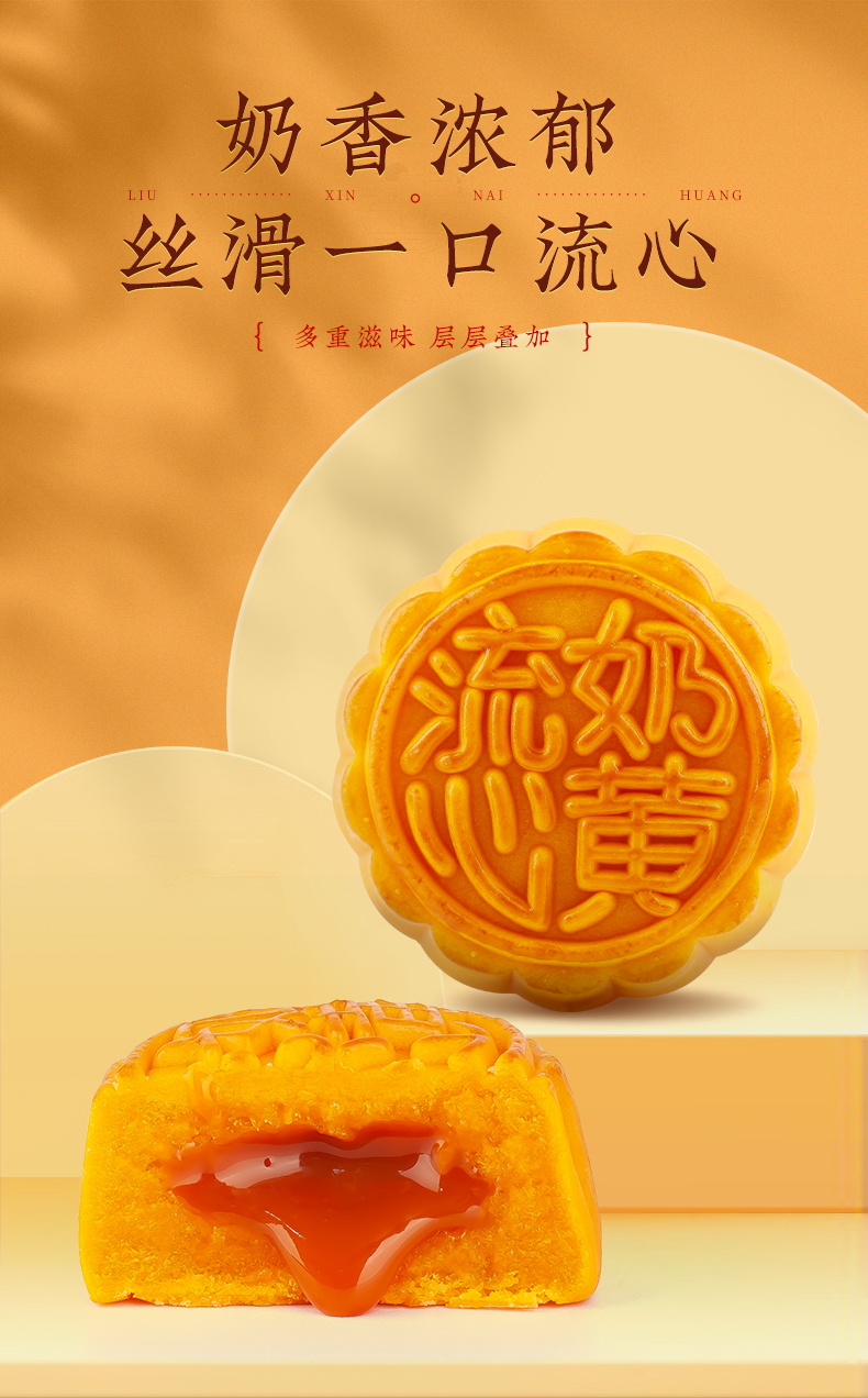 “流心月饼”是去年的大火的一款网红月饼,用适度火候烤制出酥香奶味的饼皮,搭配内里浓滑的奶黄馅料,切开月饼后就能看到幼滑的奶黄呈半溶状态流出,一口咬下,浓浓的奶黄味道充斥口腔,丰富口感,