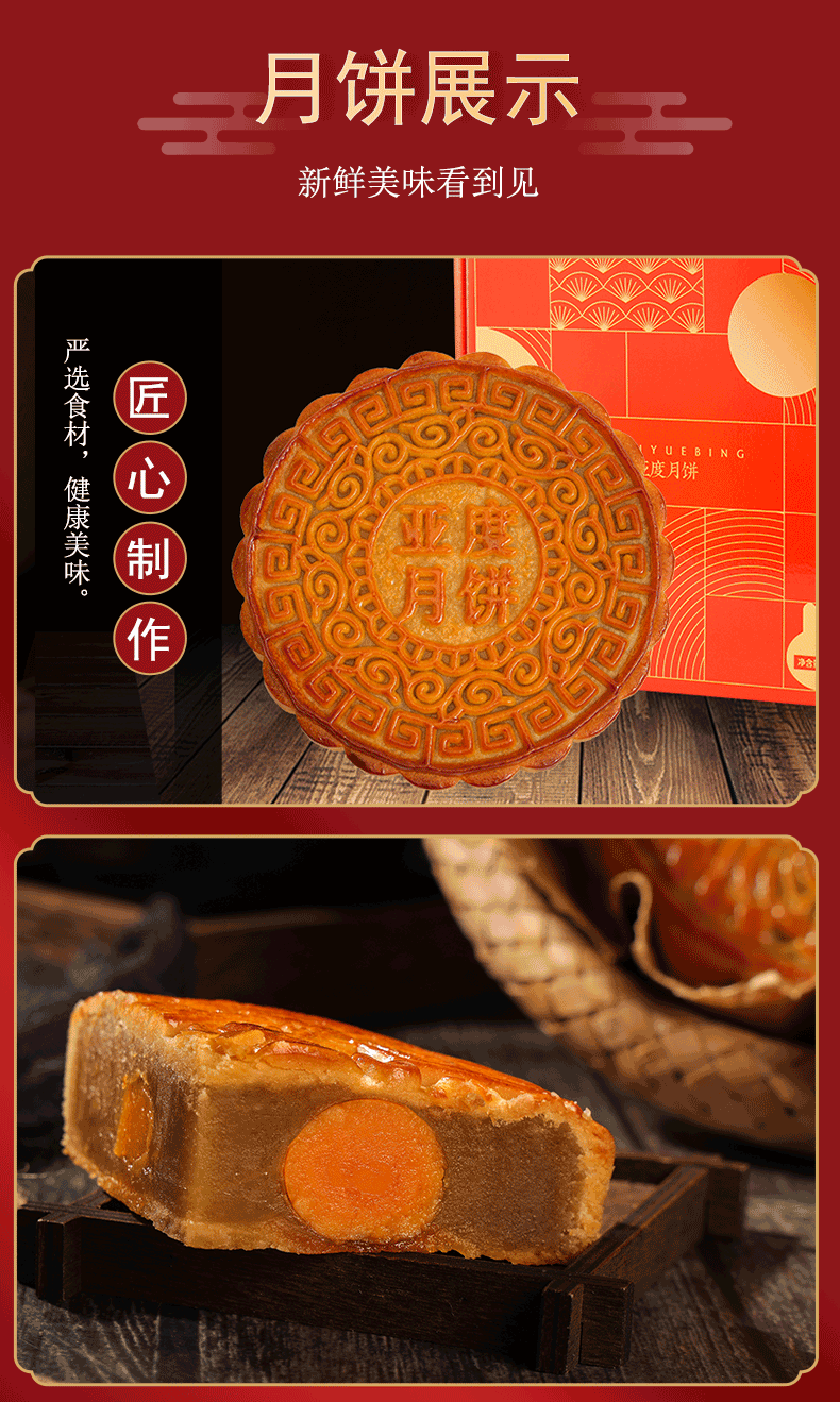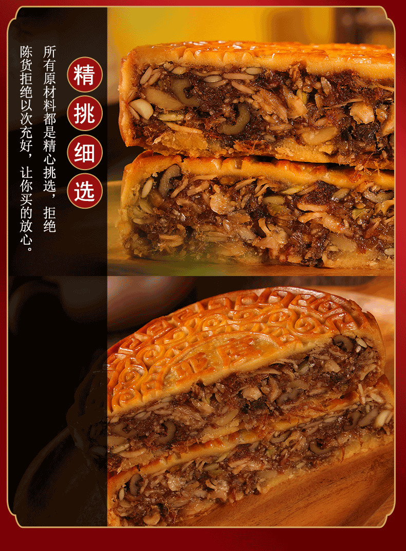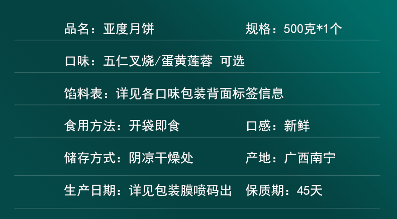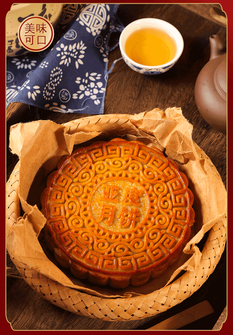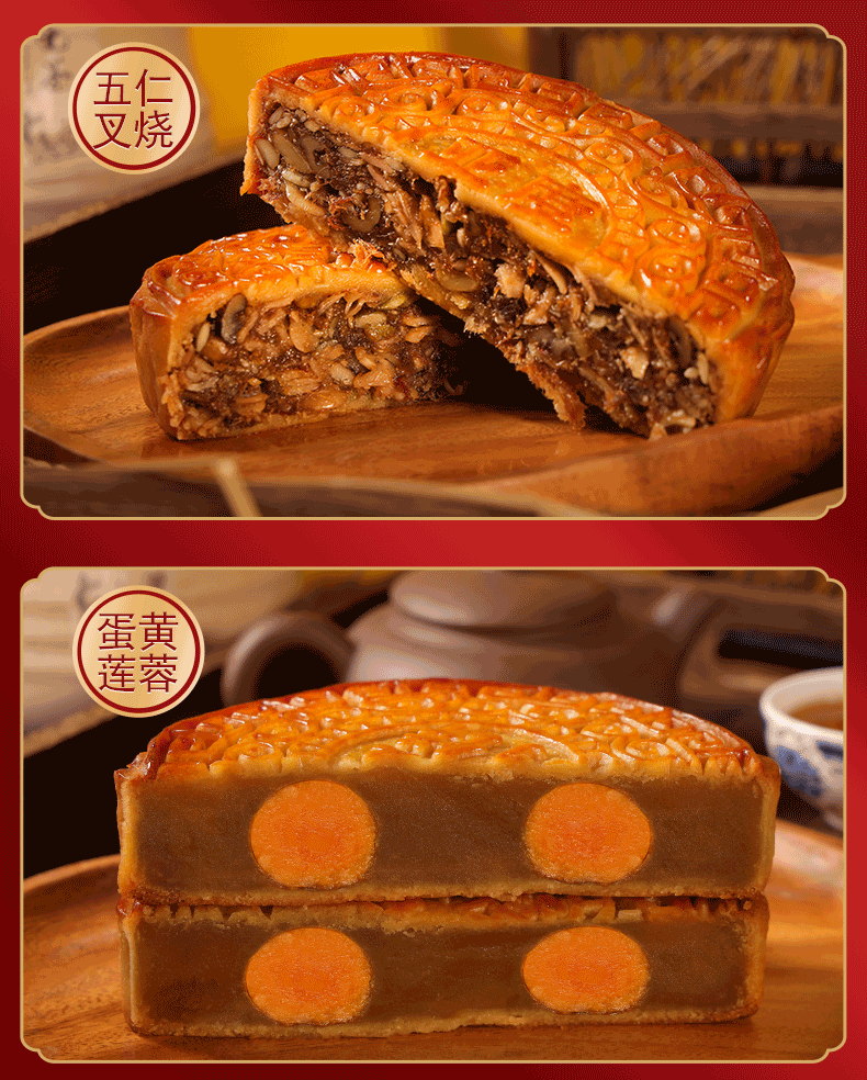 传统广式口味月饼,一斤一个大饼,精选品质食材,传统配方手工制作,色泽黄润,皮薄馅足,口感细腻,酥脆爽口,五仁叉烧、蛋黄莲蓉2种口味选择。