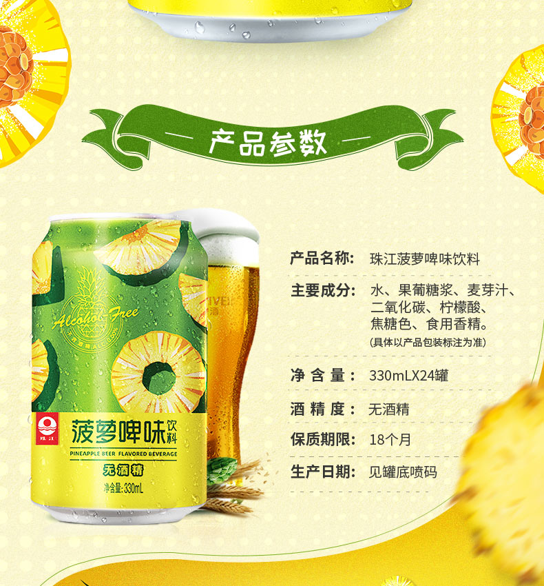 虽说名为菠萝啤,但该产品本质上其实还是汽水饮料,因为它并不含酒精。所以,你可以把它理解为菠萝啤酒味汽水,是酸甜菠萝味和劲爽啤酒香的组合。