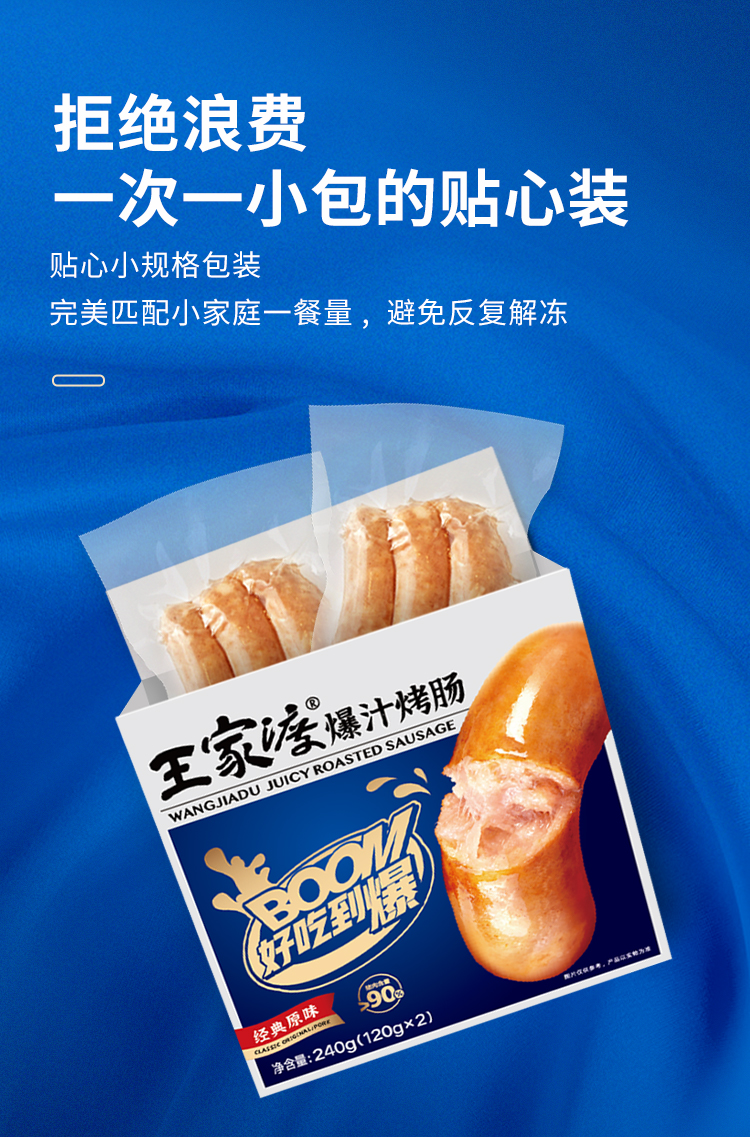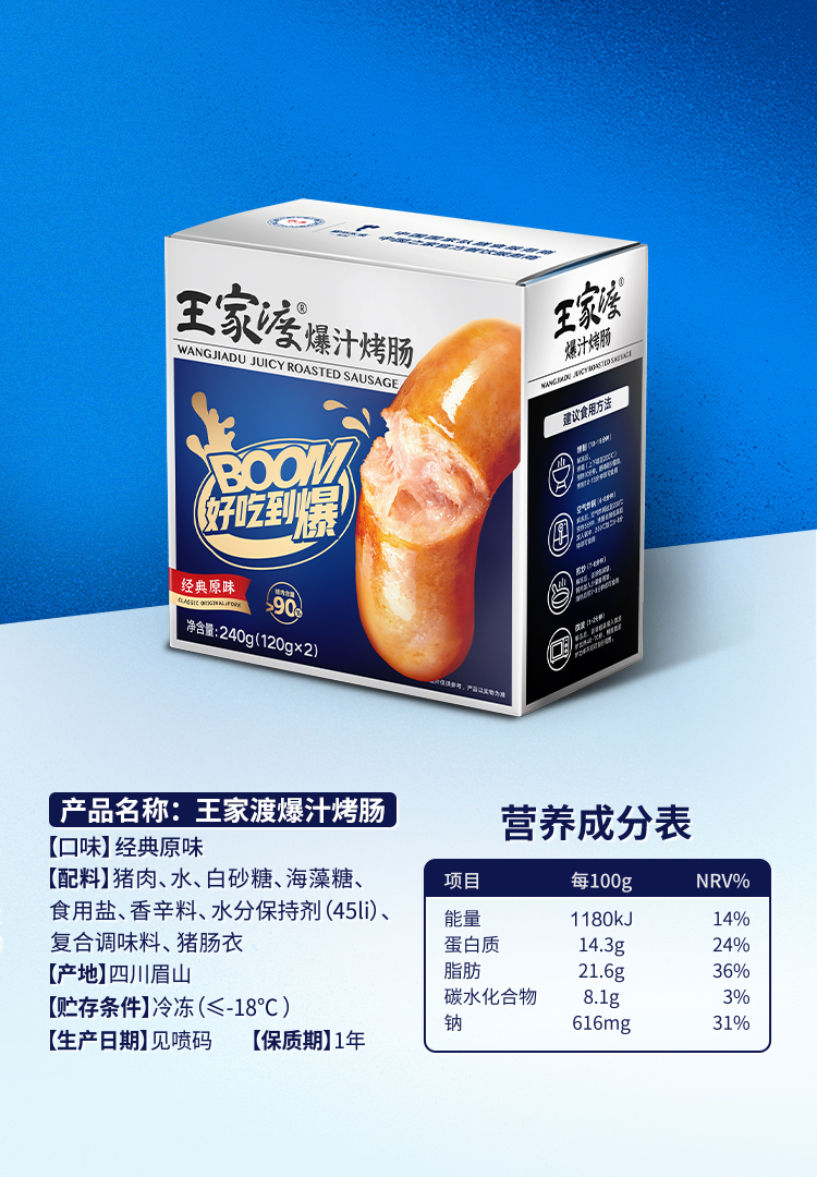 这款王家渡 爆汁火山石烤肠,使用天然猪肠衣,薄更柔韧,锁汁锁鲜咀嚼无渣,内里是90%以上的肉粒,肉感Q弹紧实,入口满嘴肉香,一口爆汁。2:8的肥瘦比例,不腻不柴,0香精、大豆蛋白、亚硝酸盐、色素、防腐剂,小份包装,食用方便。