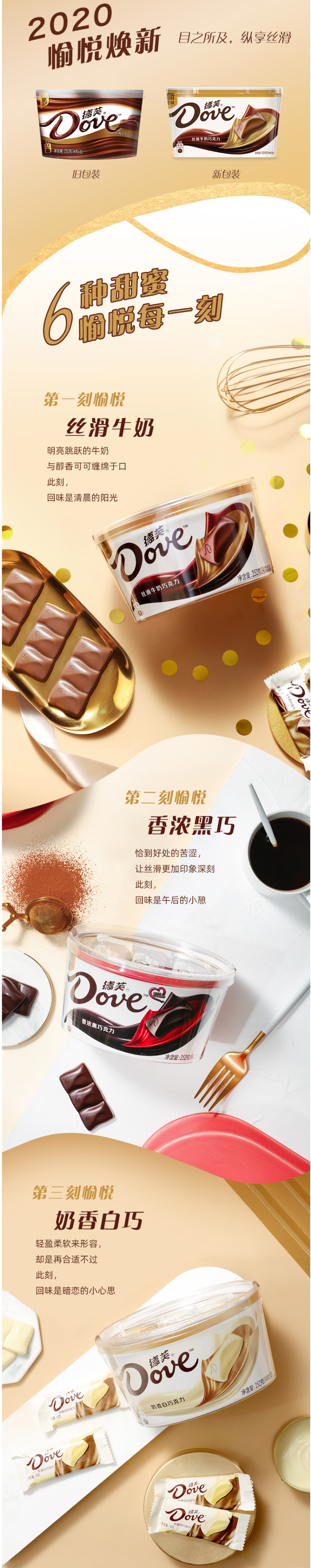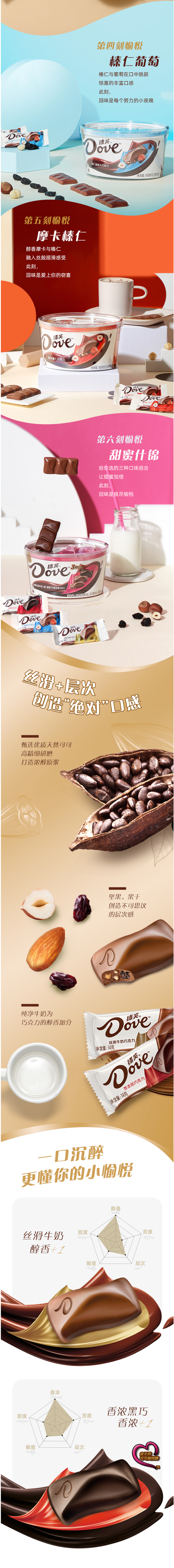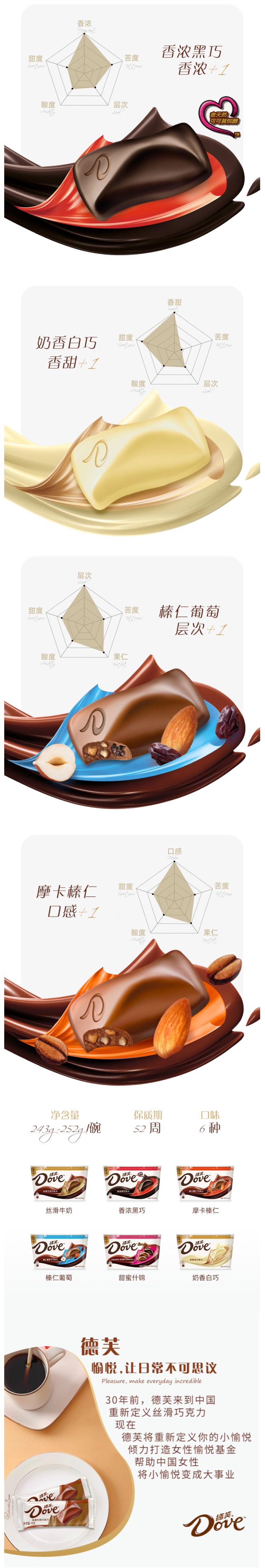 Dove德芙是美国玛氏(Mars)旗下知名巧克力品牌,据说其英文商标Dove是“DO YOU LOVE ME(你爱我吗?)”的缩写,为原本普通的巧克力增加了浓郁的感情色彩。自1989年进入中国以来,德芙已经成为中国巧克力的领导品牌。在众多巧克力品牌中,德芙应该是亲民价位里口味最好的,柔滑口感可谓是深受喜爱。