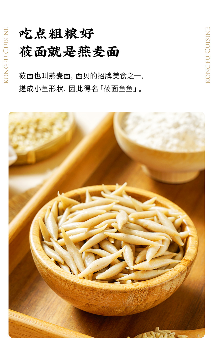莜面又叫燕麦面,不仅是西贝的经典,也是联合国公认的"十大健康食品"之一营养美味,特别适合老人、小孩吃。源自内蒙古武川,麦香、面白、筋道。莜面即燕麦面,是西贝招牌美食,趁热制成粗细均匀的莜面鱼鱼,用蒸箱蒸熟晾凉,经历了“三生三熟,口感筋道,细腻爽滑。莜面鱼鱼吃法多样,加热即食,家里常备,饿了不用等,加热后,浇上喜欢的汤汁,吸溜一口,爽滑过瘾。