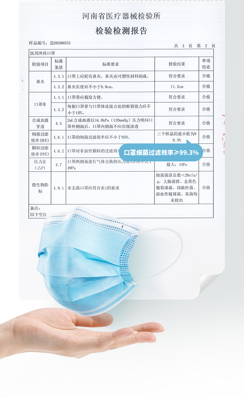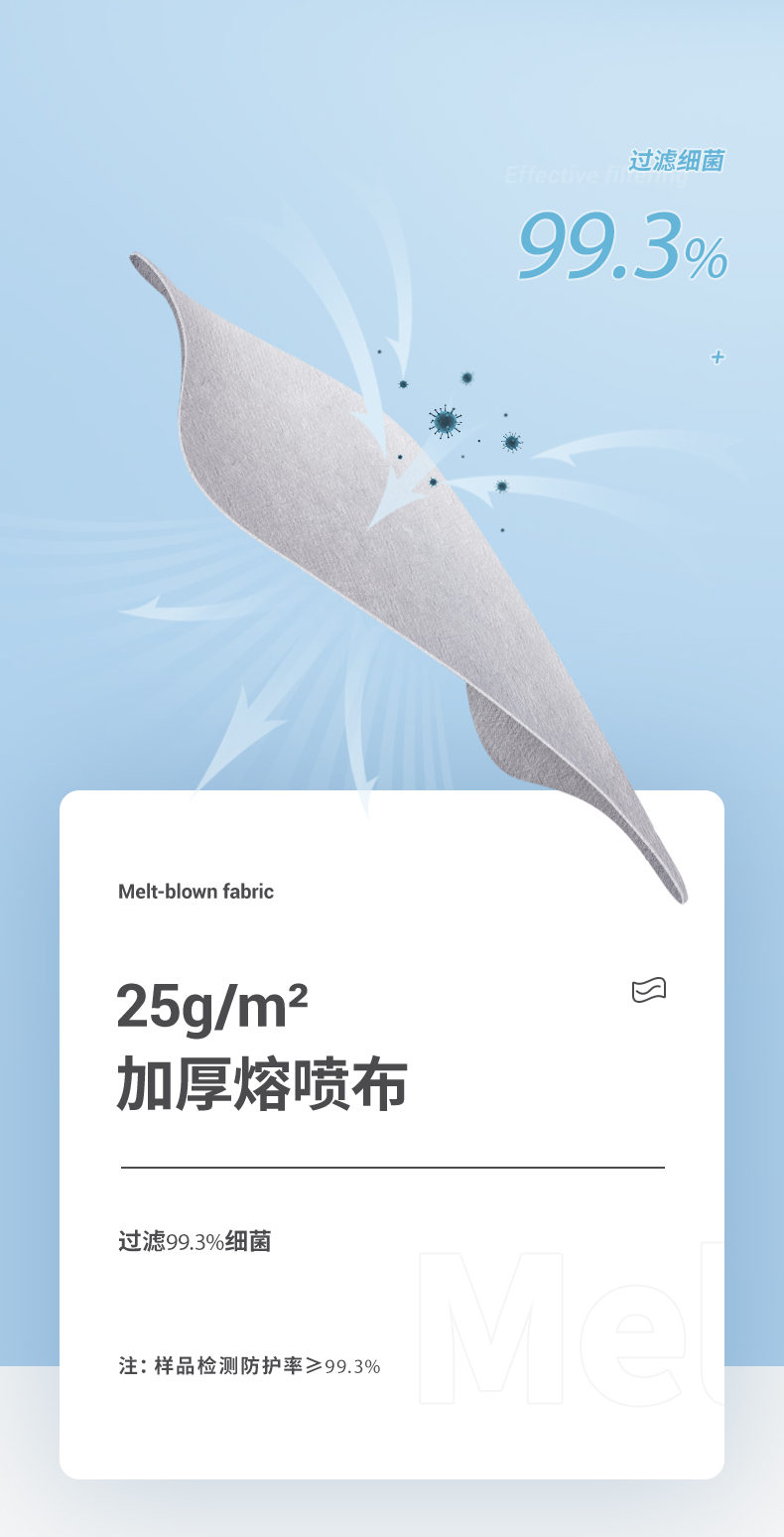 这款一次性医用外科口罩,环氧乙烷灭菌,25g/m²加厚熔喷布,细菌过滤大于99.3%(三个样品最小值),远远高于行业标准规范95%,虽然价格相比普通医用要贵一些,但是拥有更严苛的防护!建议人员流通大、存在潜在风险地区使用。