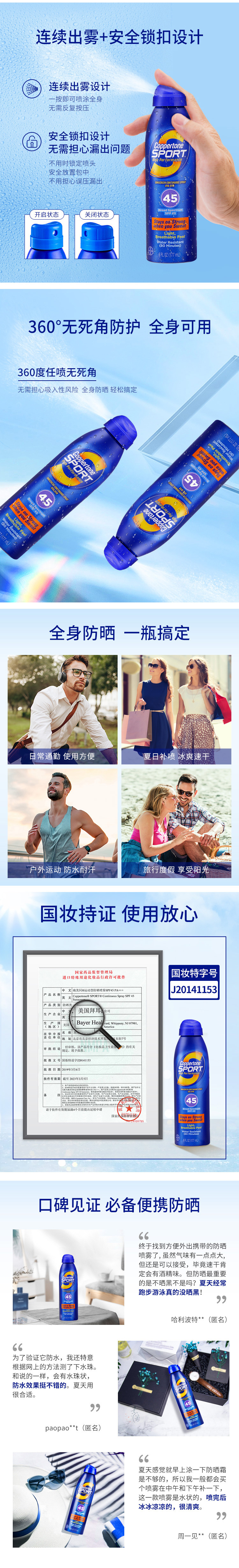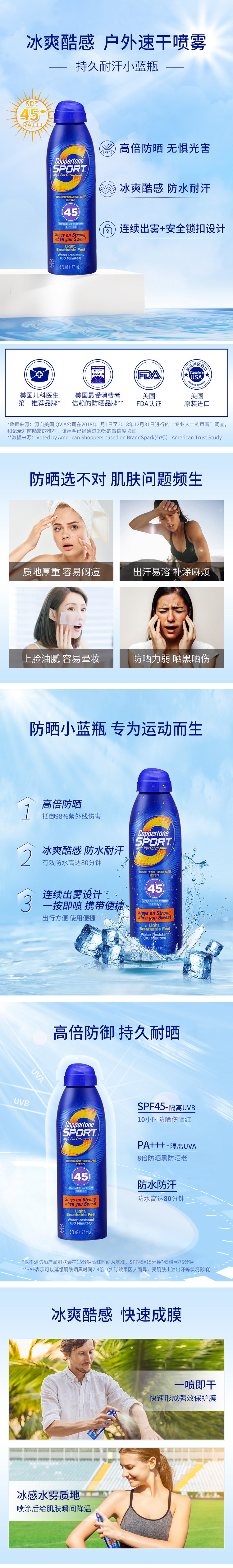 这款Coppertone 水宝宝 运动型防晒喷雾,专为运动设计,抗水抗汗,防晒指数SPF45,有效阻止UVA and UVB ,是普通防晒品的效果的50倍。即使游泳也可使用。性质温和,无刺激,不含香精,质地轻薄,面部及身体均可使用。一键喷射,清爽速干,尤其适合补涂防晒时使用,相对乳液来说方便很多。