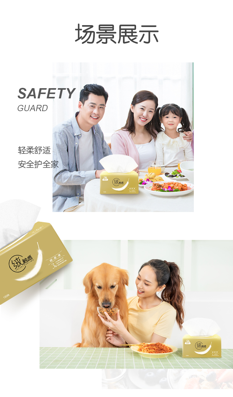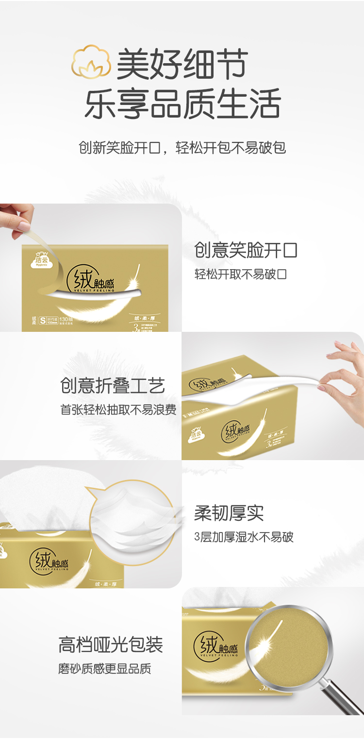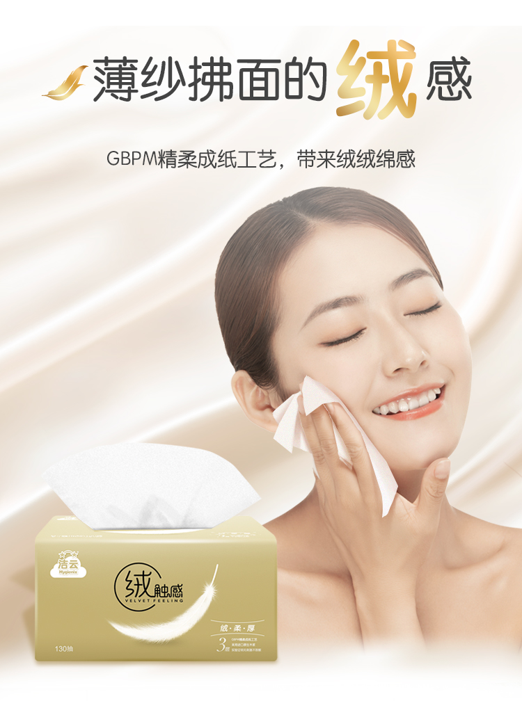 采用进口原生木浆制作,3层130抽,主打绒触感,柔软厚实,不掉纸屑,笑脸开口、哑光包装精美。