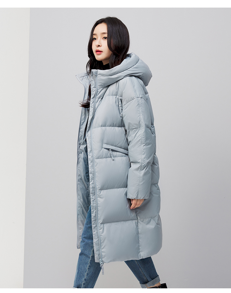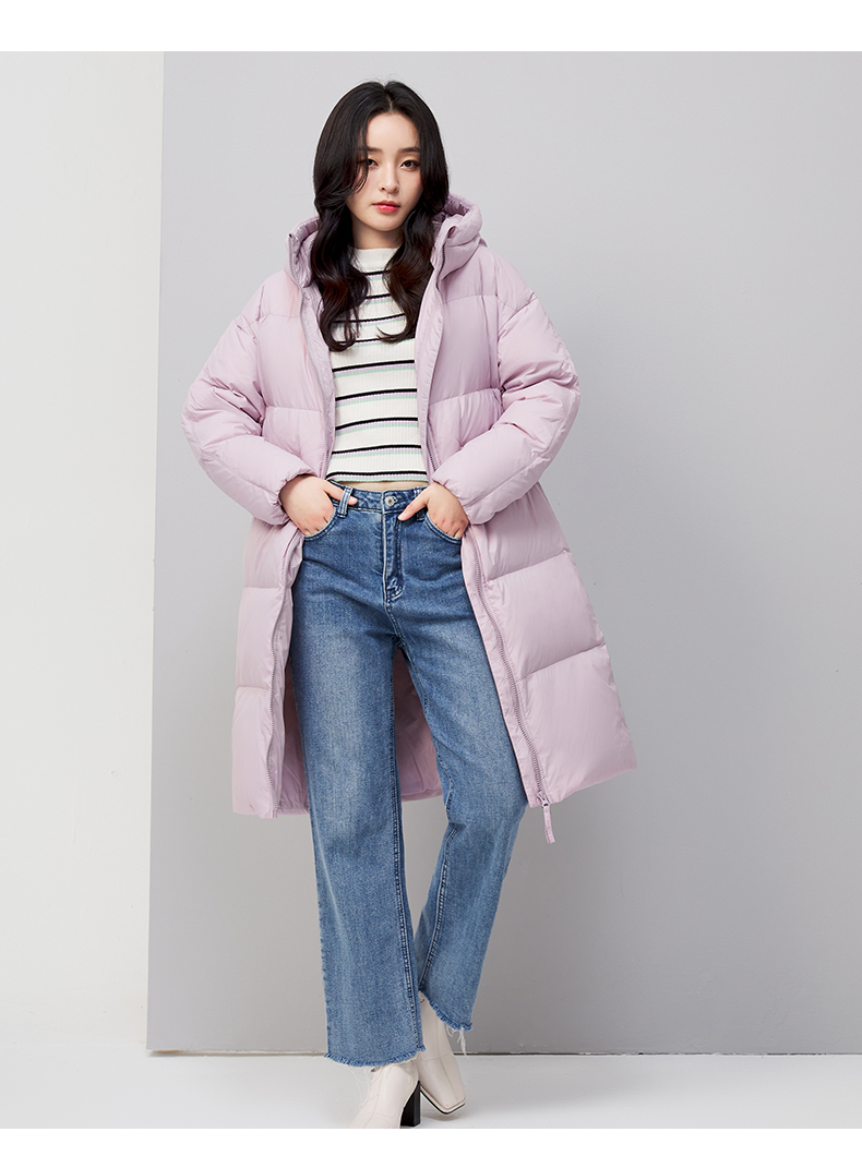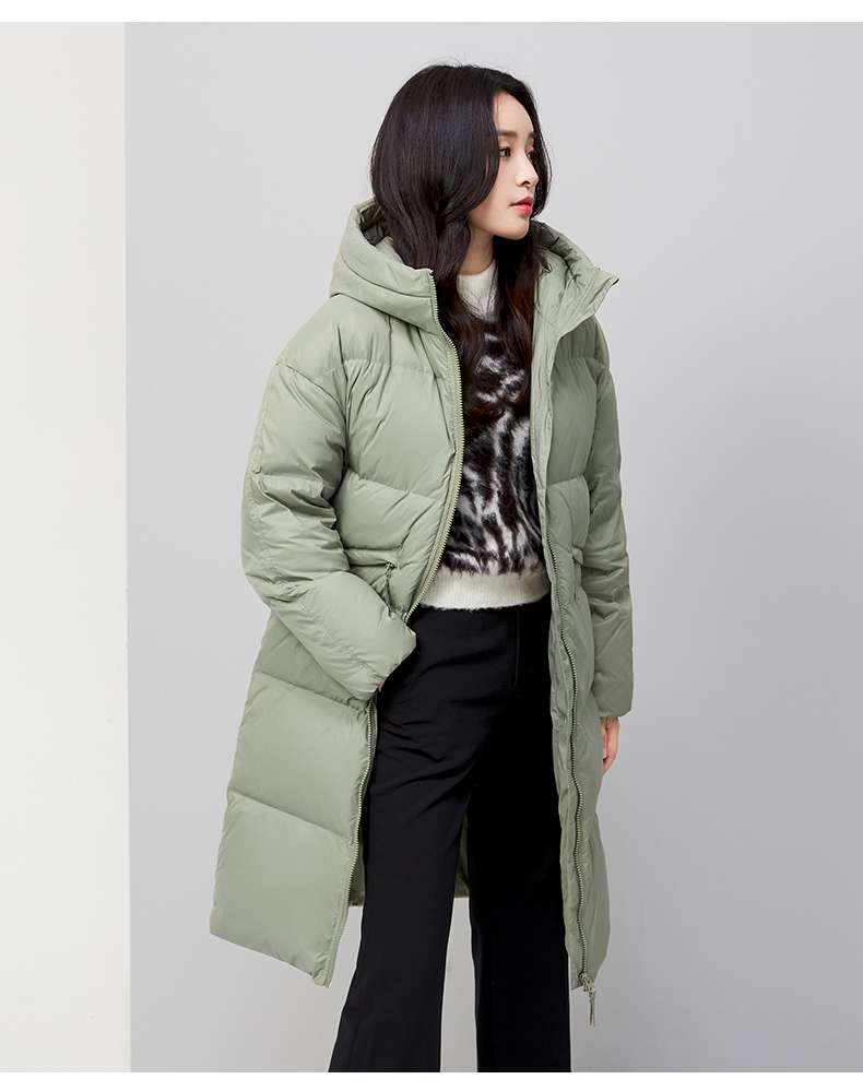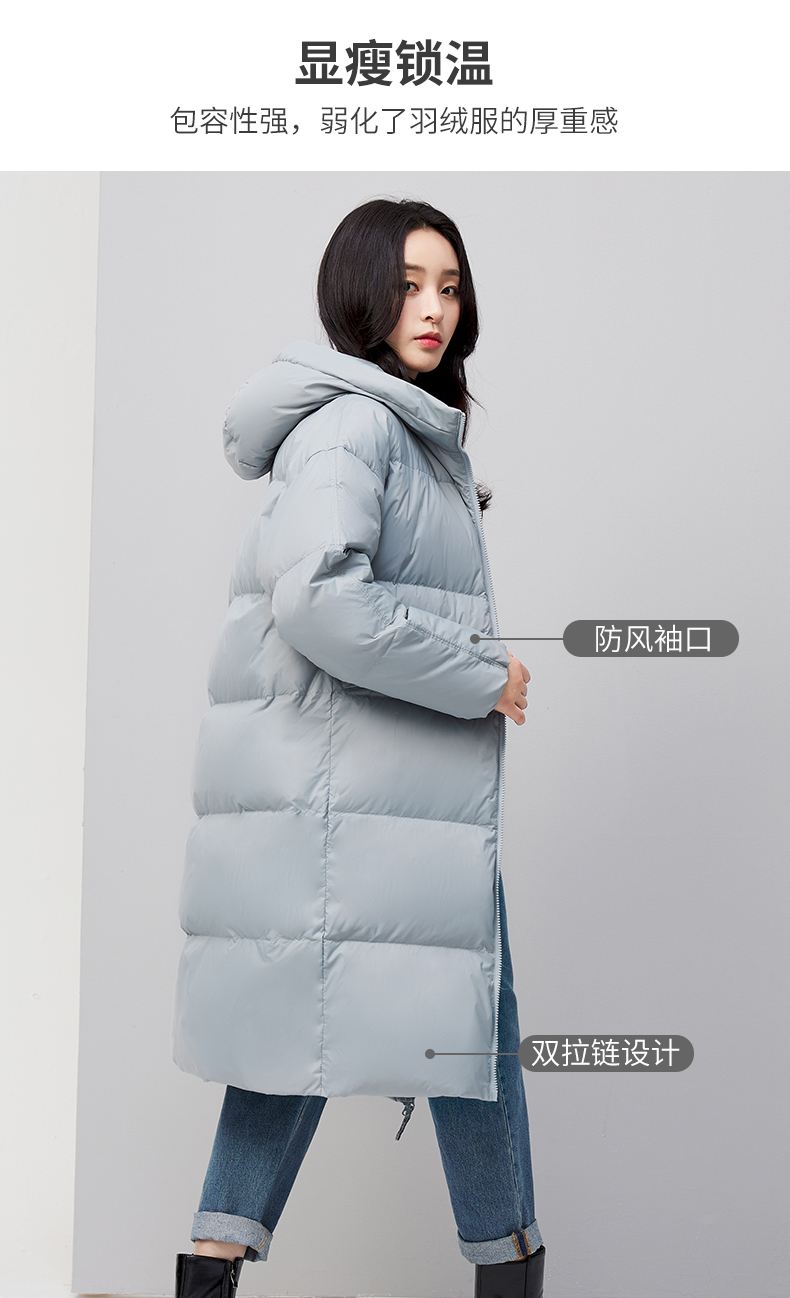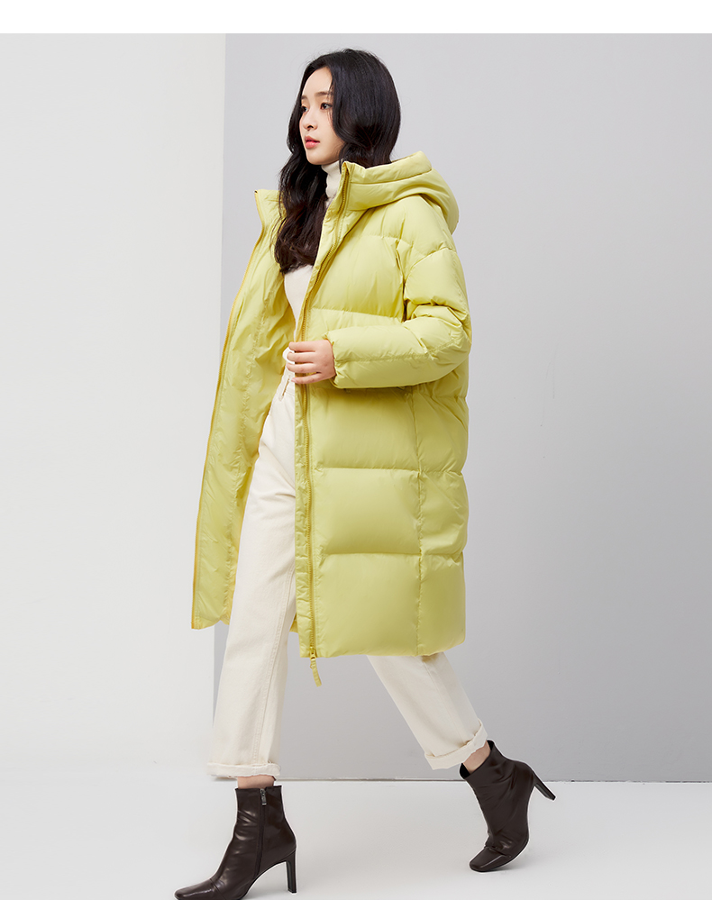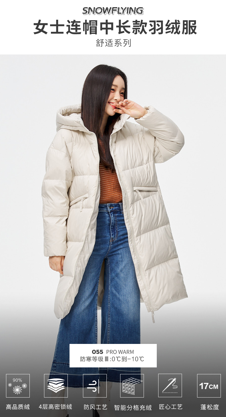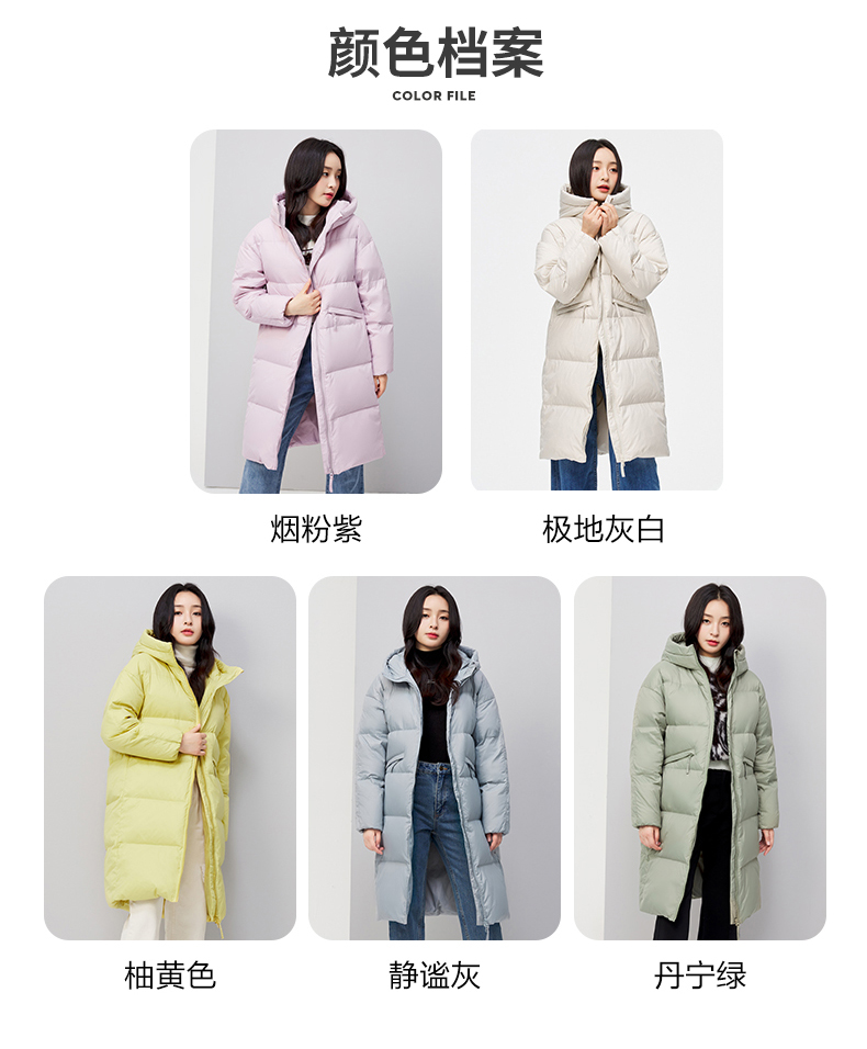 这款女士 中长款廓形羽绒服,慵懒随性,精巧的分割,拉高视觉效果,弱化了羽绒服厚重感,上身显瘦,适合各种身材MM穿着,甄选17cm+高蓬白鸭绒,90%含绒量,蓬松保暖,智能分格充绒,四层锁绒工艺杜绝钻绒烦恼。