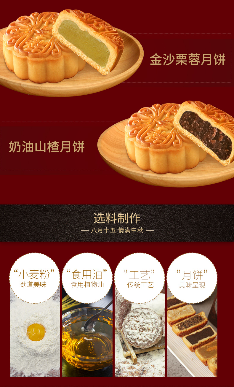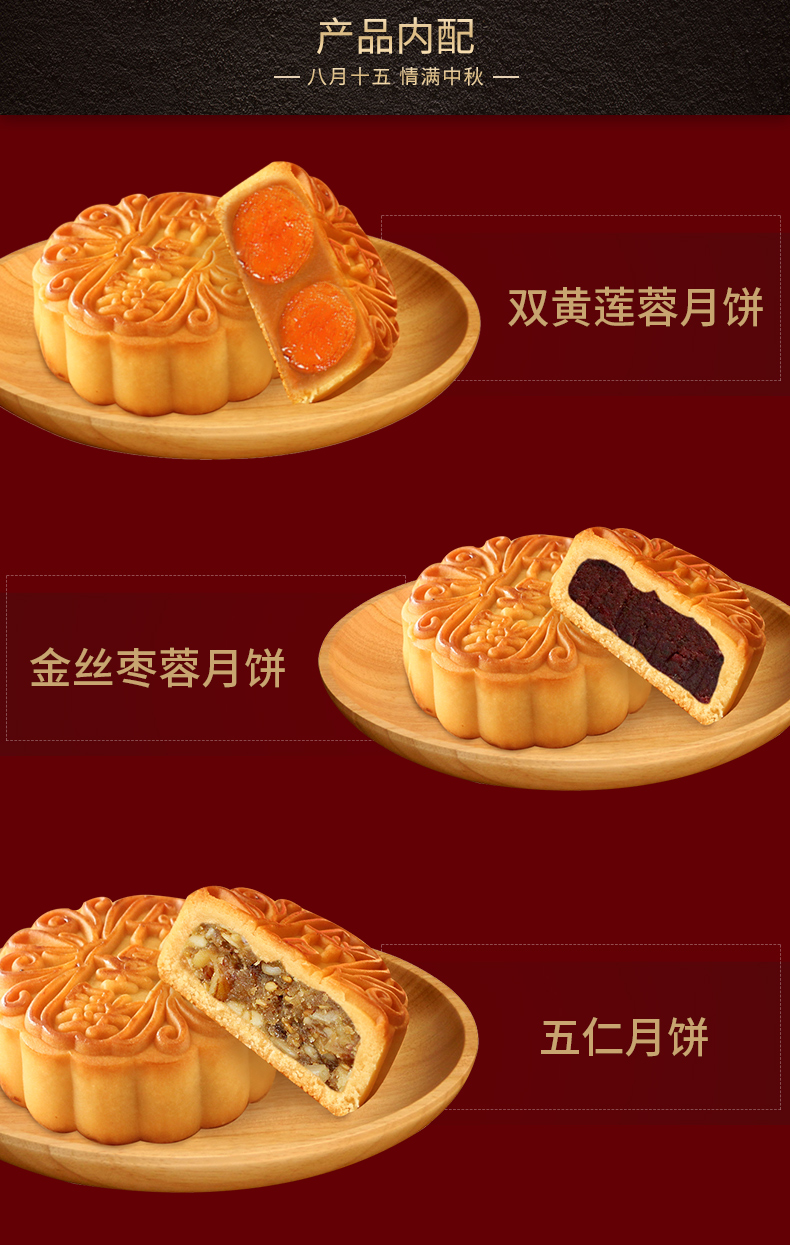 稻香经典,烫金礼盒830g,一次尝遍,广味京式8味11饼,其中包含:双黄莲蓉月饼(广式)180g*1、金丝枣蓉月饼(广式)80g*1 、黑芝麻月饼(广式)50g*2、五仁月饼(京式)80g*1、玫瑰豆沙月饼(京式)80g*1、椒盐酥月饼(京式)50g*2、金沙栗蓉月饼(京式)80g*2、奶油山楂月饼(京式)50g*1、
