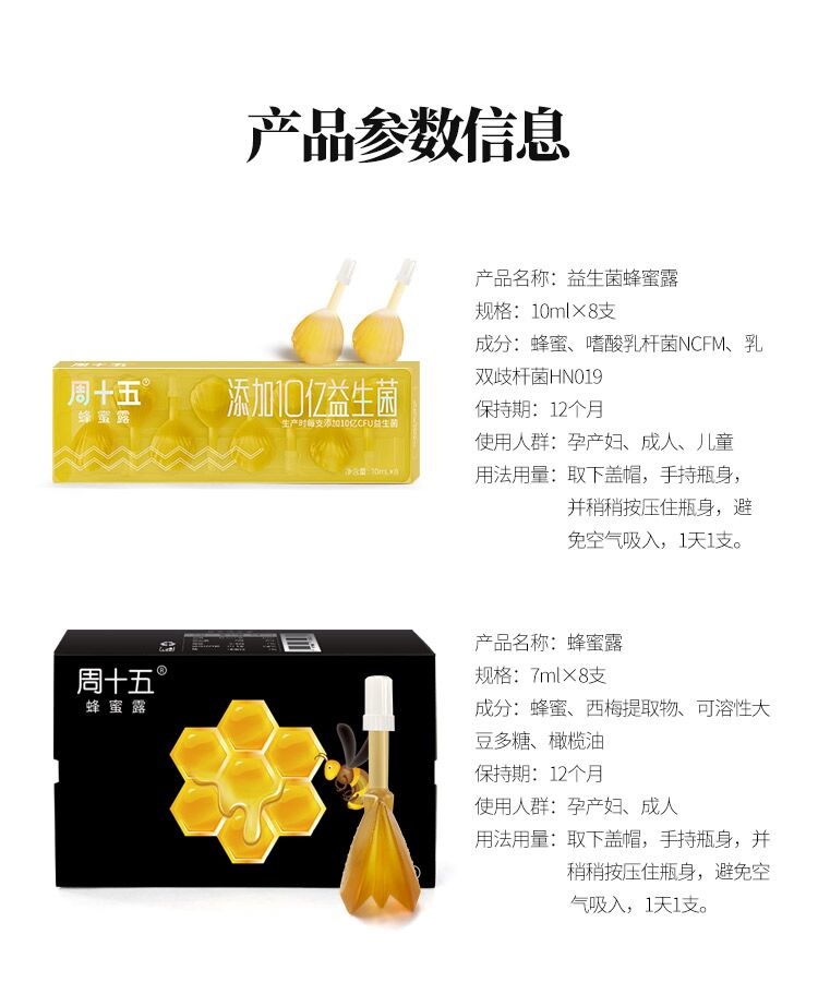 这款周十五 10亿益生菌蜂蜜露,成分只有益生菌和蜂蜜,无其他添加。使用进口杜邦益生菌/乳双歧杆菌HN019和嗜酸乳杆菌NCFM,每支含量达到了10亿CFU益生菌,能改善肠道,排便更顺畅,经过安全认证,孕妇、产后、成人、儿童、老人均可使用。