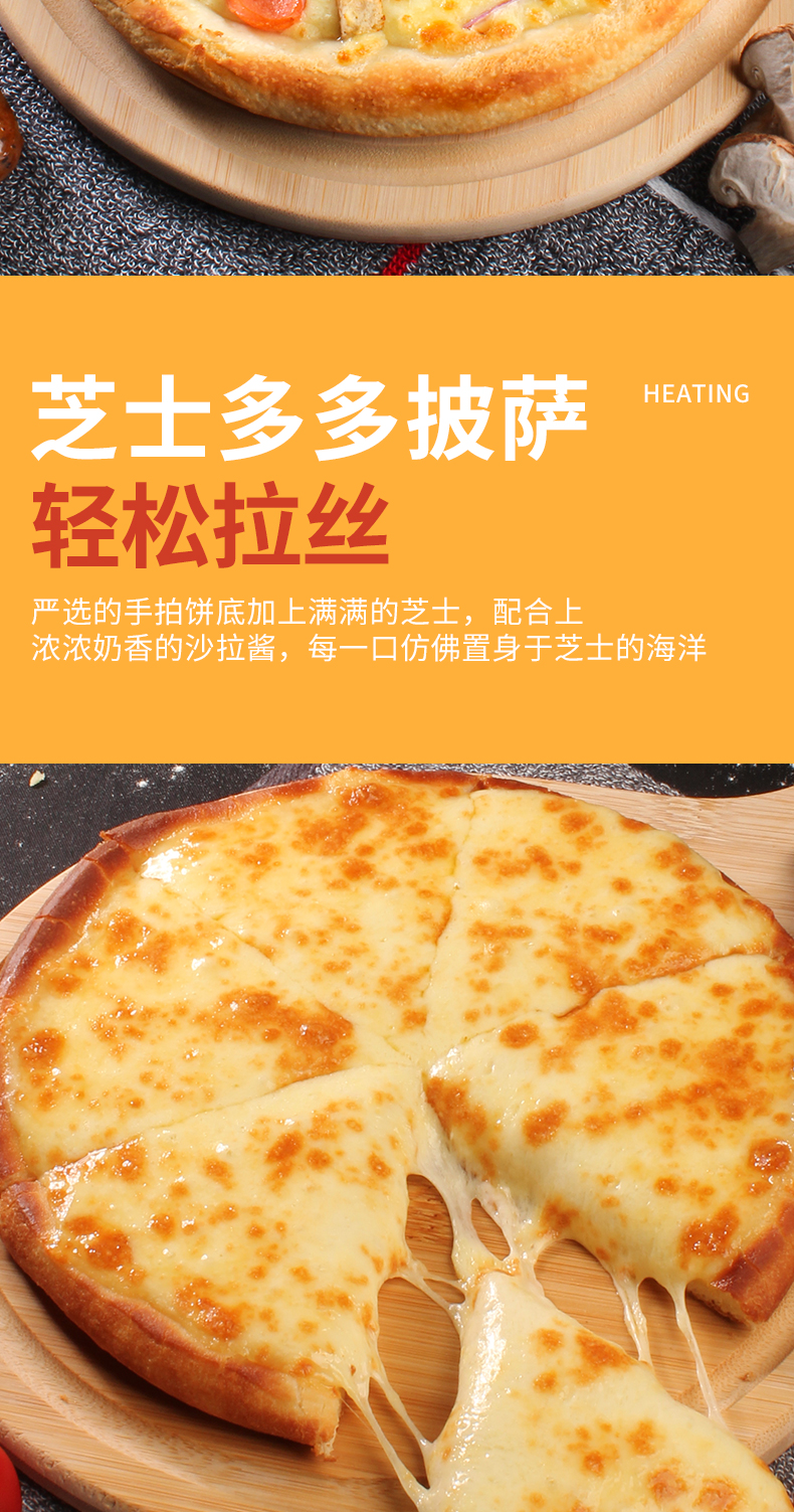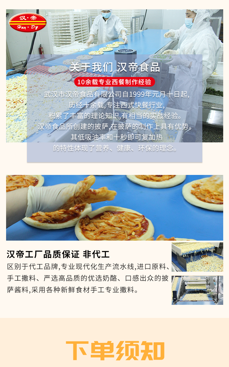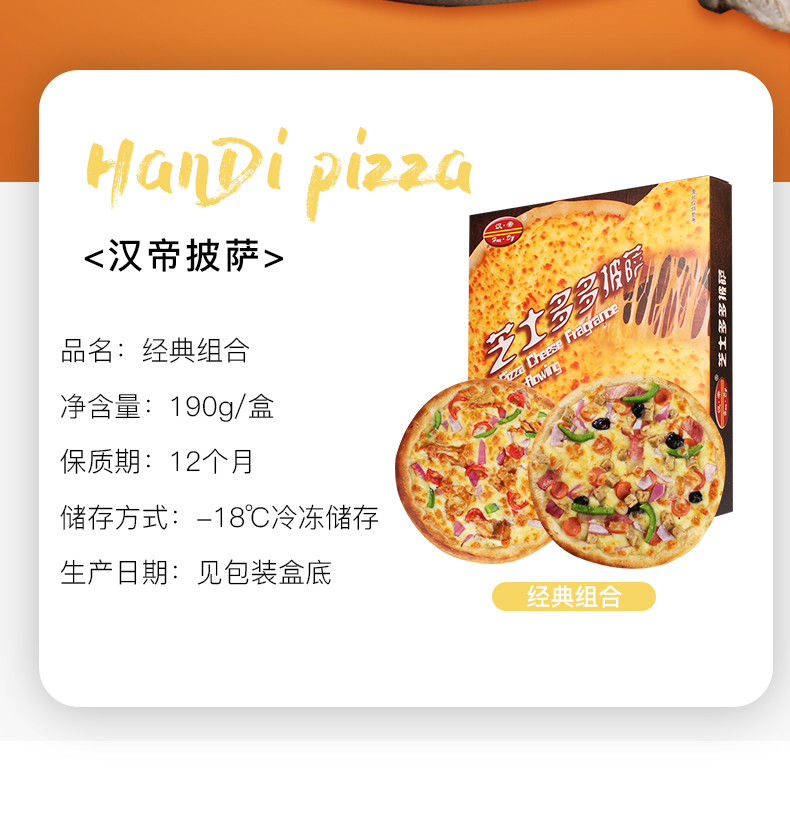 汉帝即食成品披萨,线下10年品牌店,纯手工制作,用料十足,肉粒丰富,香浓可口,奶酪拉丝,饼皮酥脆,干净卫生!2分钟加热即食!在家也能吃到香喷喷的披萨!!
