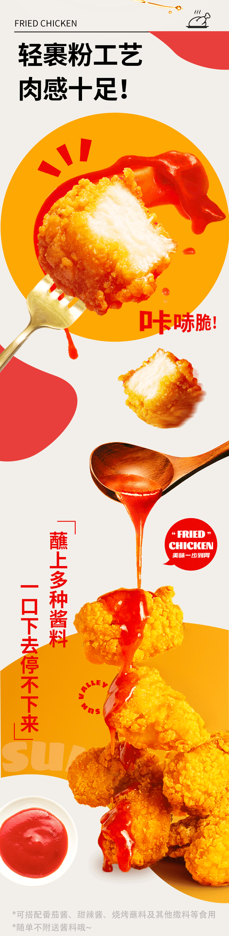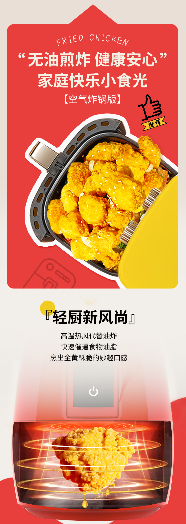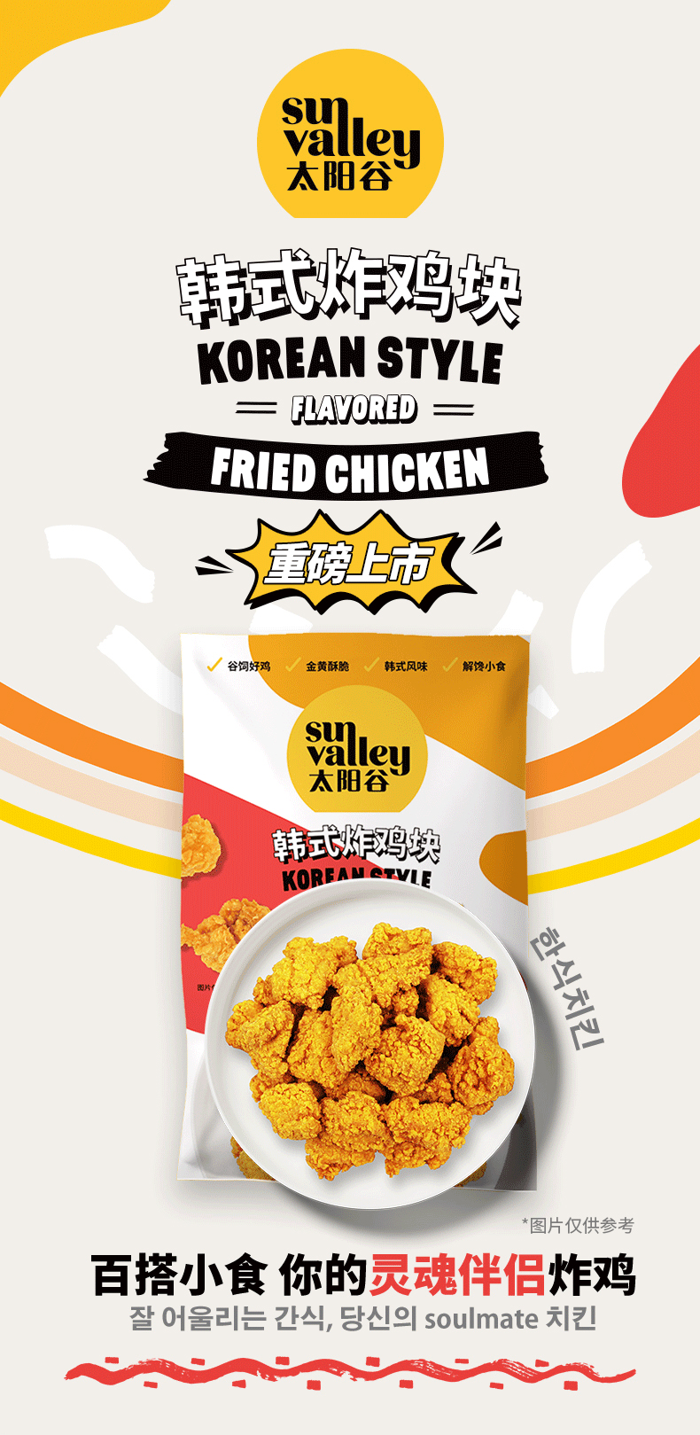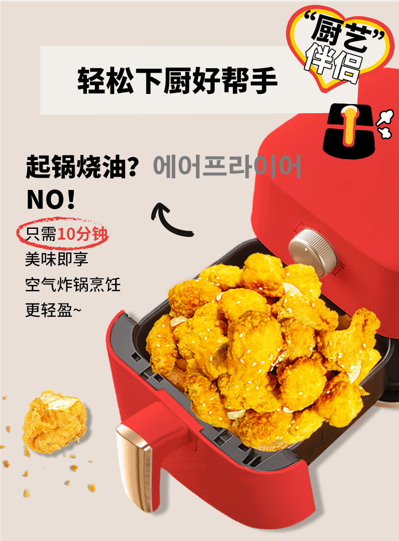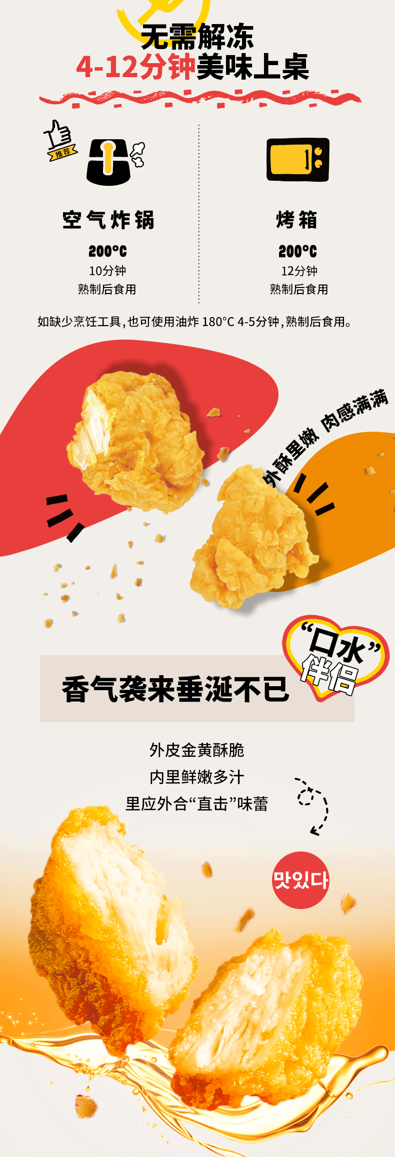 韩式炸鸡,精选白羽鸡整切鸡胸肉,肉多裹粉薄,入口外酥里嫩,色泽金黄 肉嫩多汁,只需空气炸锅转12分钟,在家也可以做的韩式炸鸡!