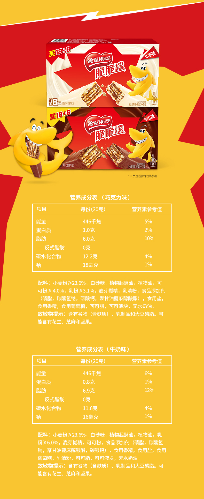 天猫雀巢官方旗舰店71.8元,可领26元优惠券,实付45.8元到手,雀巢脆脆鲨巧克力威化,由美味香滑的雀巢巧克力,包裹着松脆的花生味威化夹层而成,零反式脂肪,酥脆香甜,一口满足。
