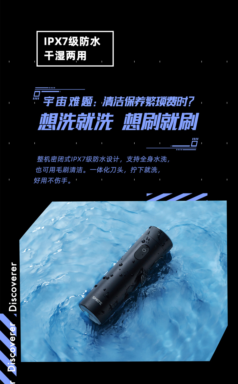 转速高达4500转的强劲马达,比起普通旋转剃须刀的180马达要高很多,会有一种涡轮增压般的剃须感受,噪音很低,仅仅是刀头刮下胡子时的咔咔声。IPX7高级防水,淋浴过程中,也可以用它来刮胡子,刀头可以直接用水冲洗,使用方便。