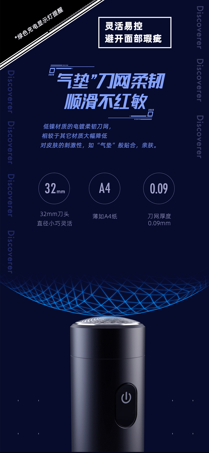 小品生态链须眉出品,剃须刀,32mm直径刀头,外型有点像大号的口红,简洁质感,符合小米一贯的风格,体积小巧,适合出差旅行携带。特色是刀网的涡轮结构,0.09mm厚度,亲肤贴合,925个孔洞以回旋形式逐渐增大,剃须没有死角,同时避免拉扯、卡顿现象。