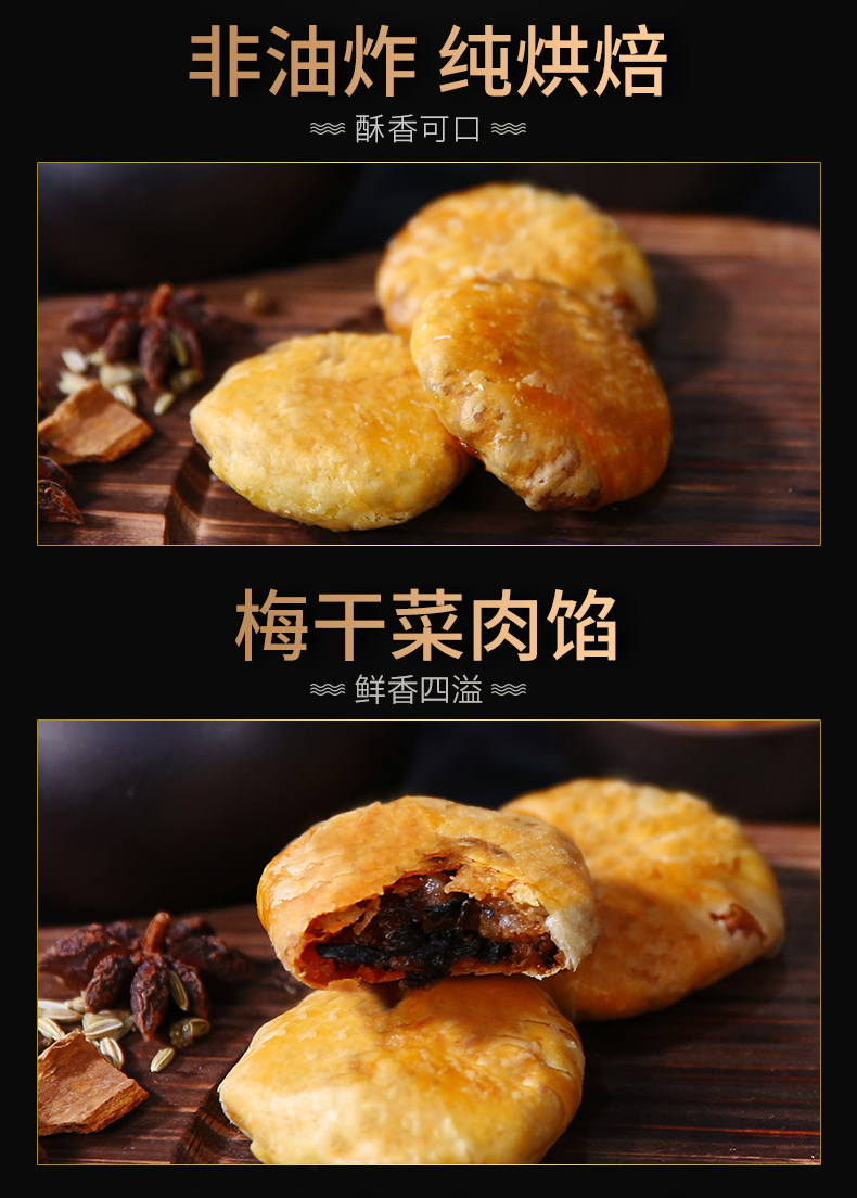 这款小酥饼秉承古法工艺制作,出炉后的酥饼层次分明,鲜香四溢,纯烘焙制作,不添加任何防腐剂,非油炸更健康,内里馅料咸香,有满满的肉香和梅干菜的香味,非常好吃,严格执行ISO22000食品安全管理体系,吃着放心,内有独立小包装,更易携带,吃起来更方便。