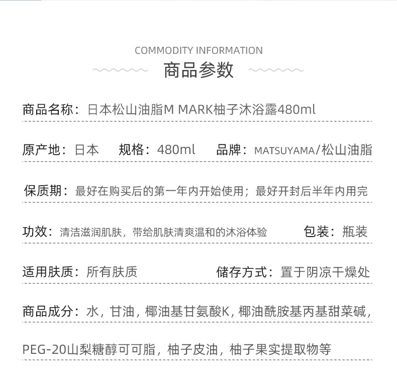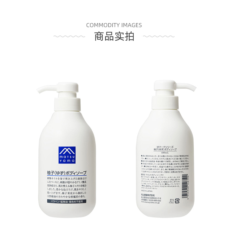 这款日本 松山油脂 M MARK 柚子沐浴露,天然古法工艺沐浴露,是以传统天然古法制法,精心烧成的液体香皂。无添加温和配方,萃取天然柚子果皮油,清爽保湿不粘腻,保湿成分甘油提高泡沫保水力和持续力,深层滋润,防止肌肤皲裂。花果中萃取的自然精油,清甜柚子香,清爽怡人。低刺激的氨基酸系洗净成分,适合各种不同肤质的人群使用。