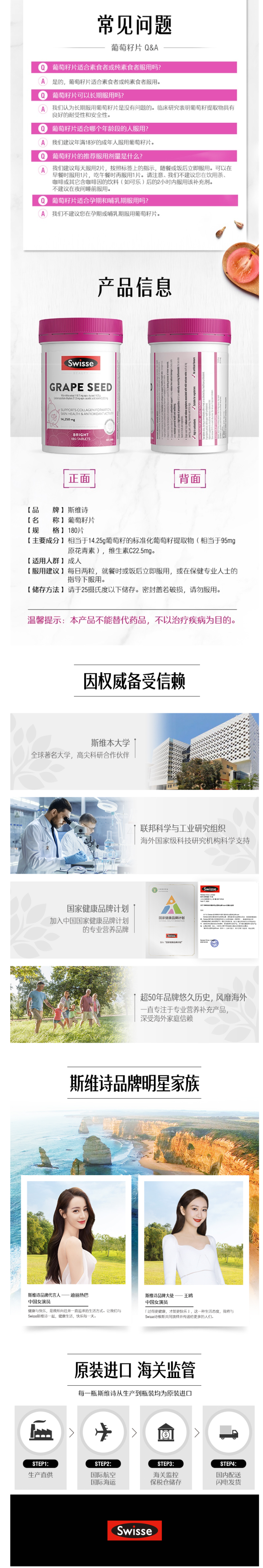这款Swisse 葡萄籽片,澳大利亚原装进口,精选高含量葡萄籽多酚的优质葡萄,高吸收利用率,超强抗氧化,有助于推迟或减少色斑、皱纹的出现,减轻辐射对皮肤的影响,爱美的女士、长期对着电脑、熬夜的上班族都可以尝试一下。