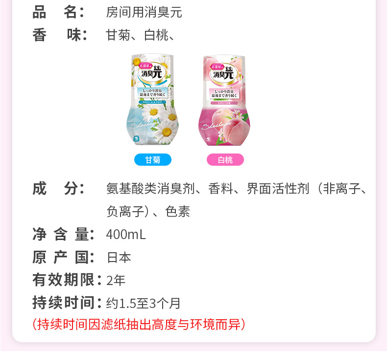 这款小林制药 消臭元 空气清新剂,呈液态形式。日本原产,香味可持续1.5~3个月。