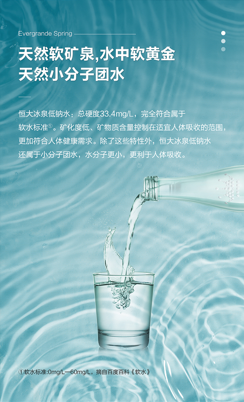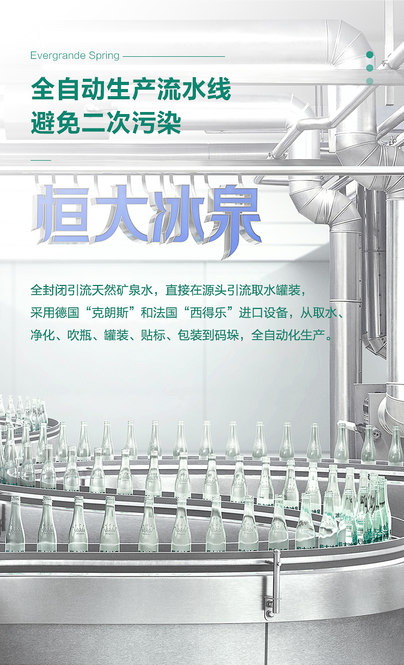 恒大冰泉经世界权威鉴定机构——德国Fresenius检测,鉴定结论为“口感和质量与世界著名品牌矿泉水相近,部分指标更优”。PH值7.02-7.98,弱碱性,更适合人体,富含丰富矿物质,健康安全。