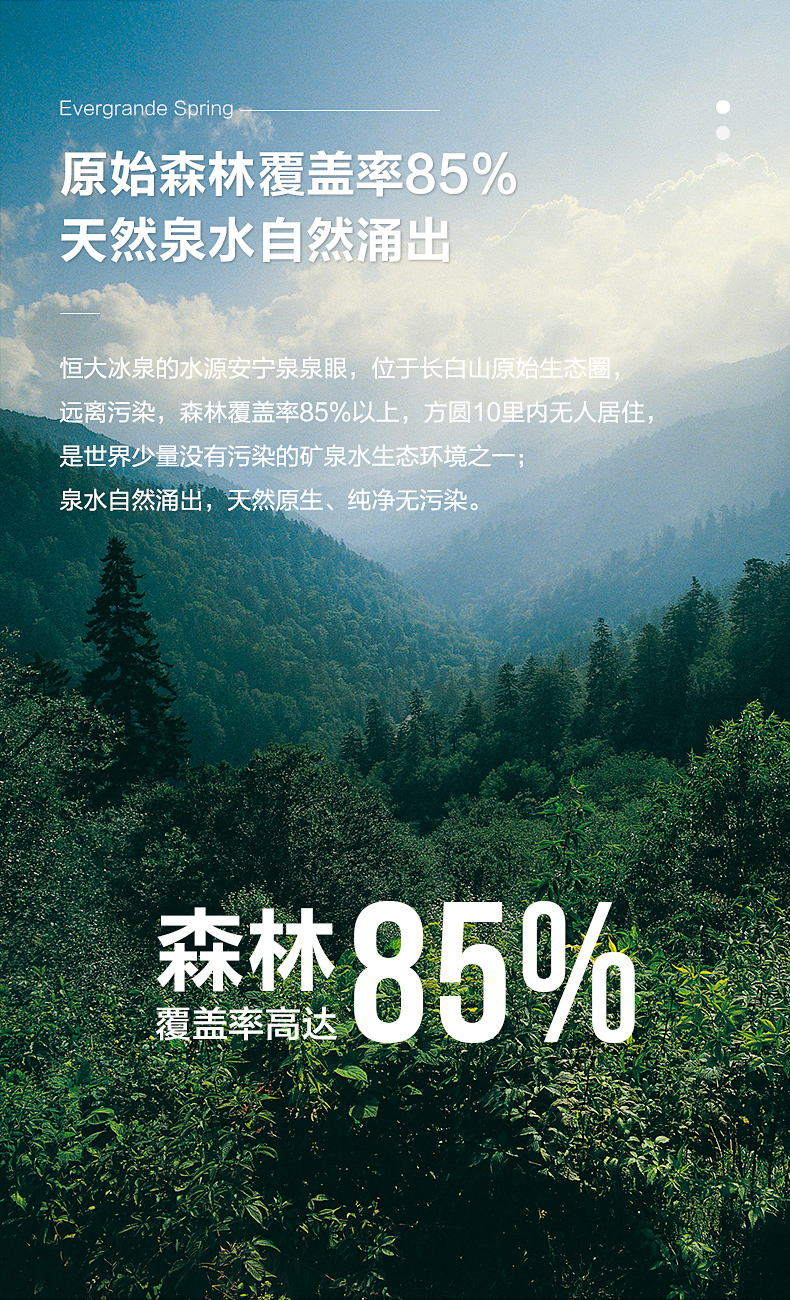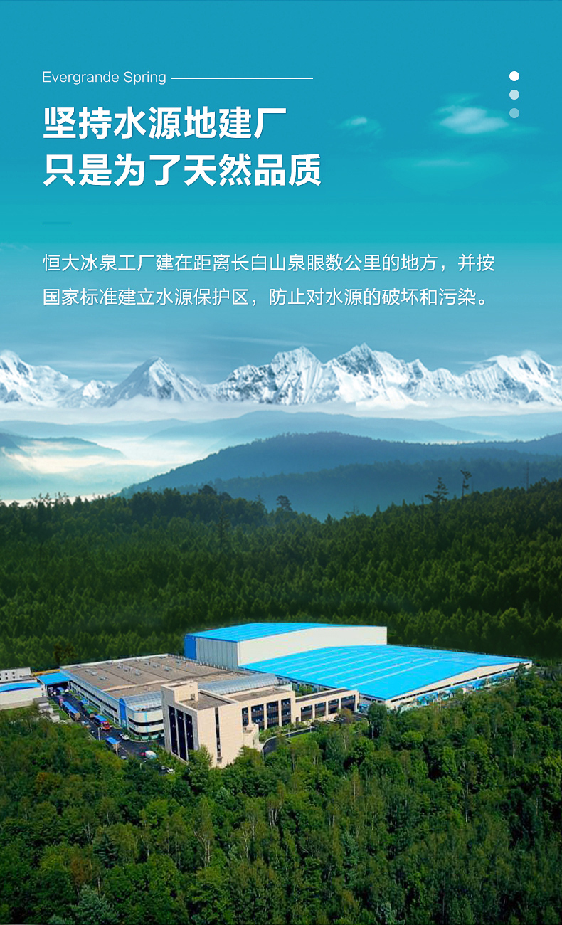 恒大冰泉的水源地为吉林省长白山深层矿泉,与欧洲阿尔卑斯山、俄罗斯高加索山一并被公认为世界三大黄金水源地。长白山深层矿泉,是经过地下千年深层火山岩磨砺,百年循环、吸附、溶滤而成,属火山岩冷泉。水温常年保持在6-8℃,水质中的矿物成分及含量相对稳定,水质纯净、零污染,口感温顺清爽。
