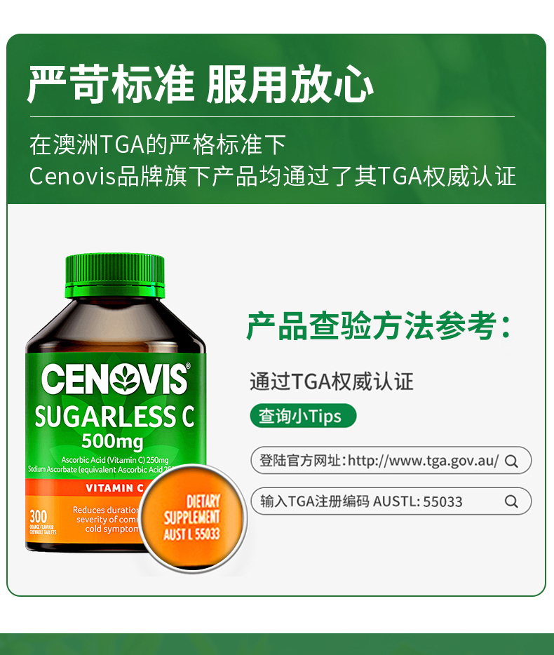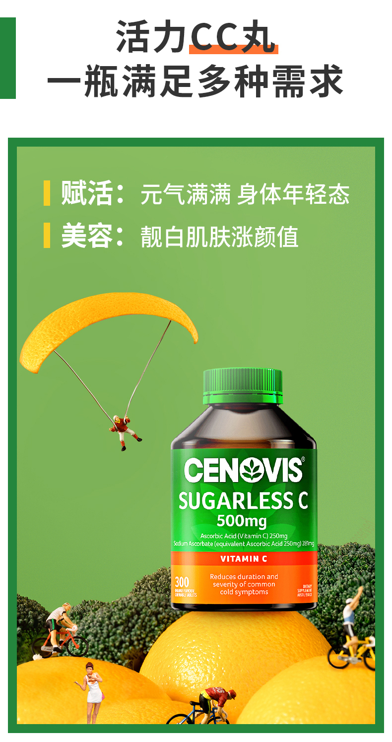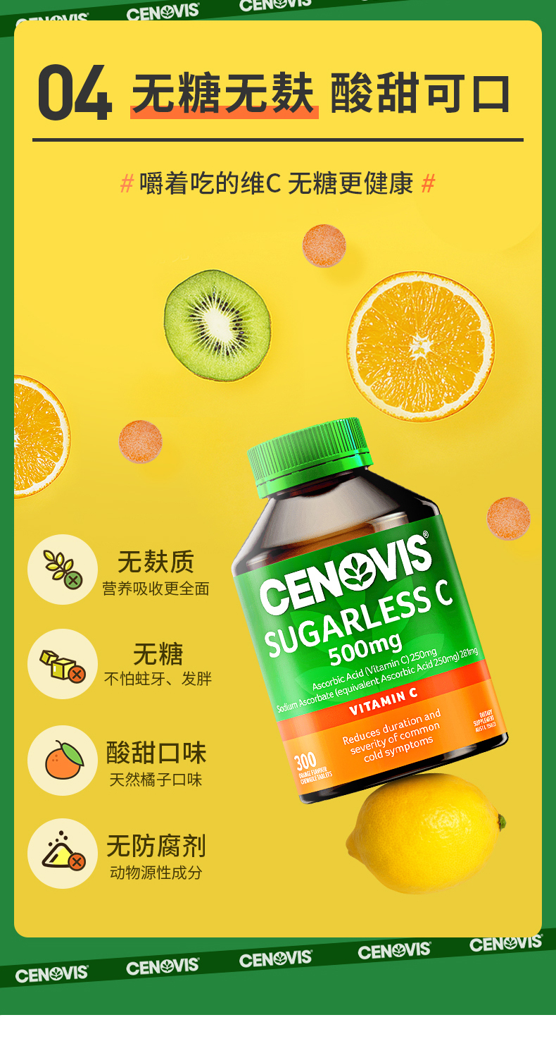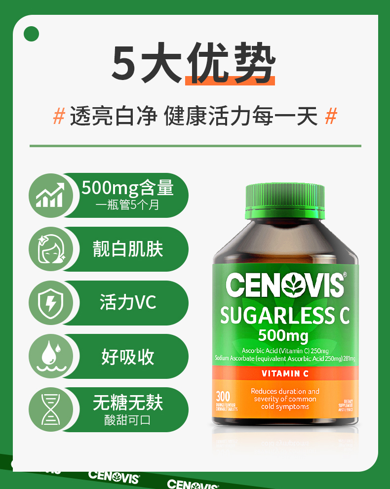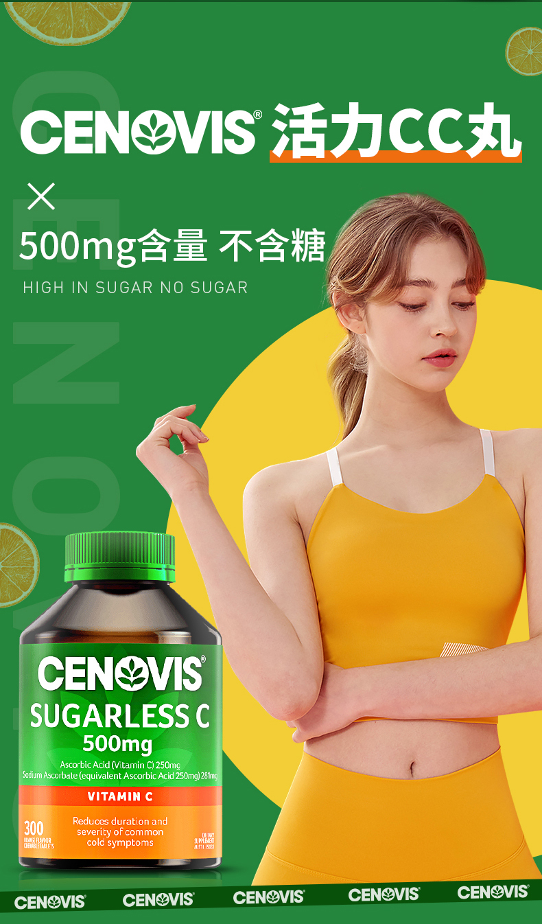 这款Cenovis维生素C咀嚼片,1000%澳洲原装进口,每片含维生素C 500mg(抗坏血酸250mg,抗坏血酸钠281mg),一片相当于20个橙子,天然橙味,酸酸甜甜的口感大家都爱吃,酸酸甜甜的口感大家都爱吃,特别是无糖配方的设计,连糖尿病人都可服用,一直服用也不担心会蛀牙或者发胖。