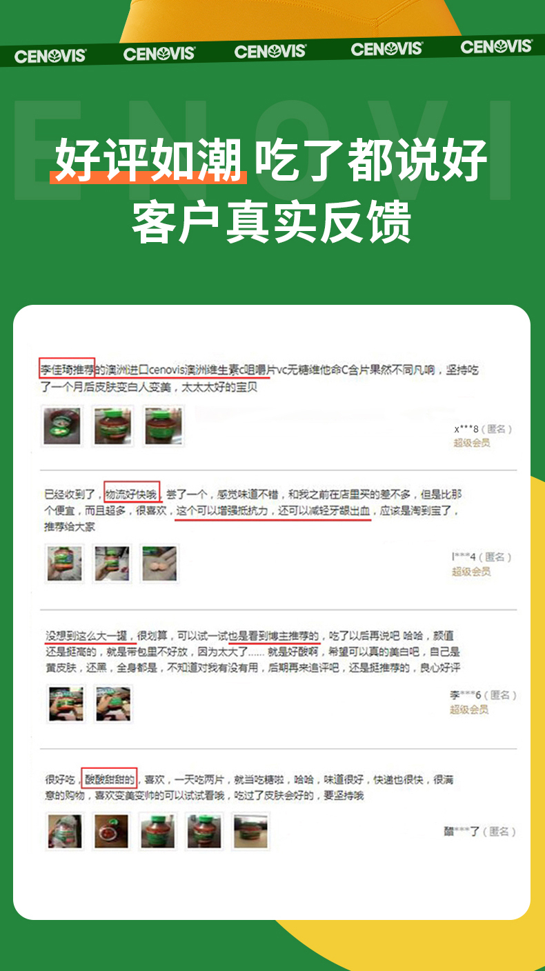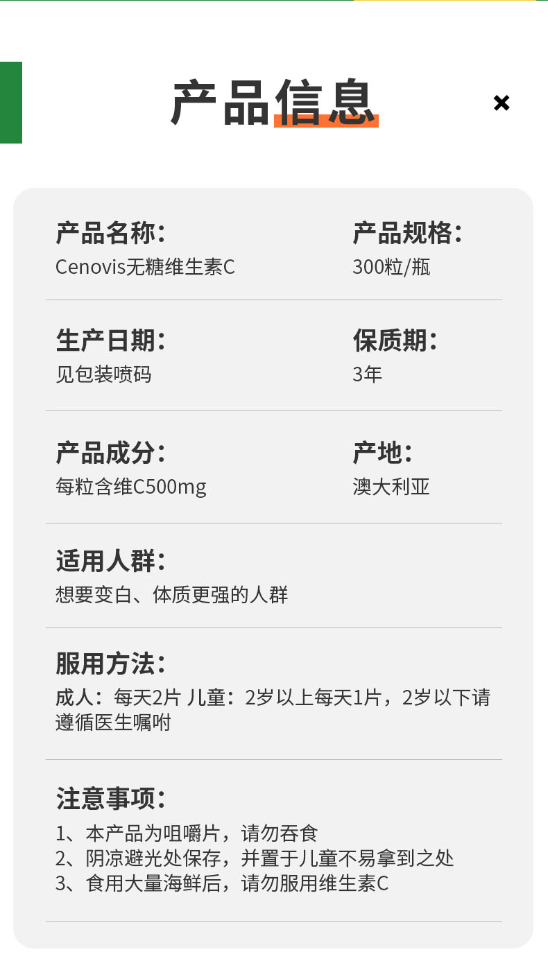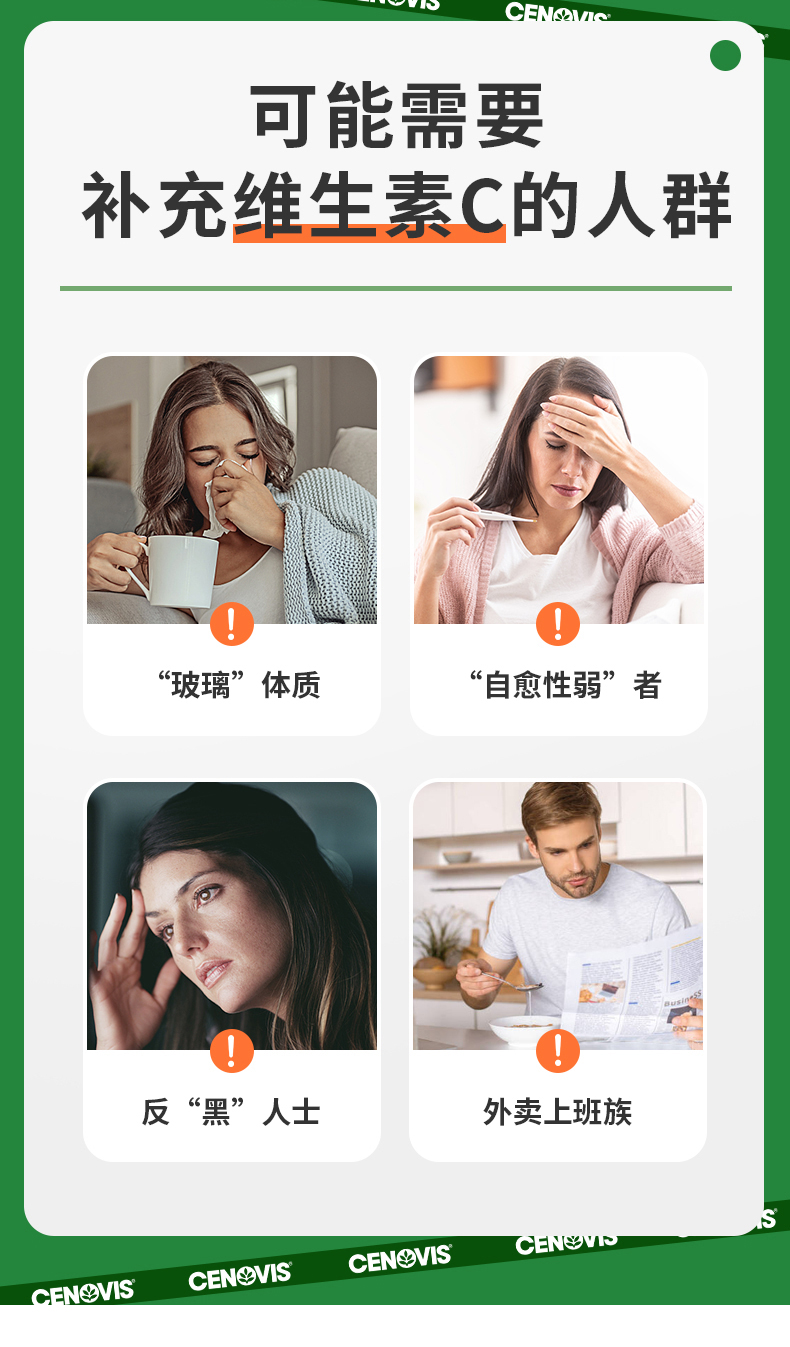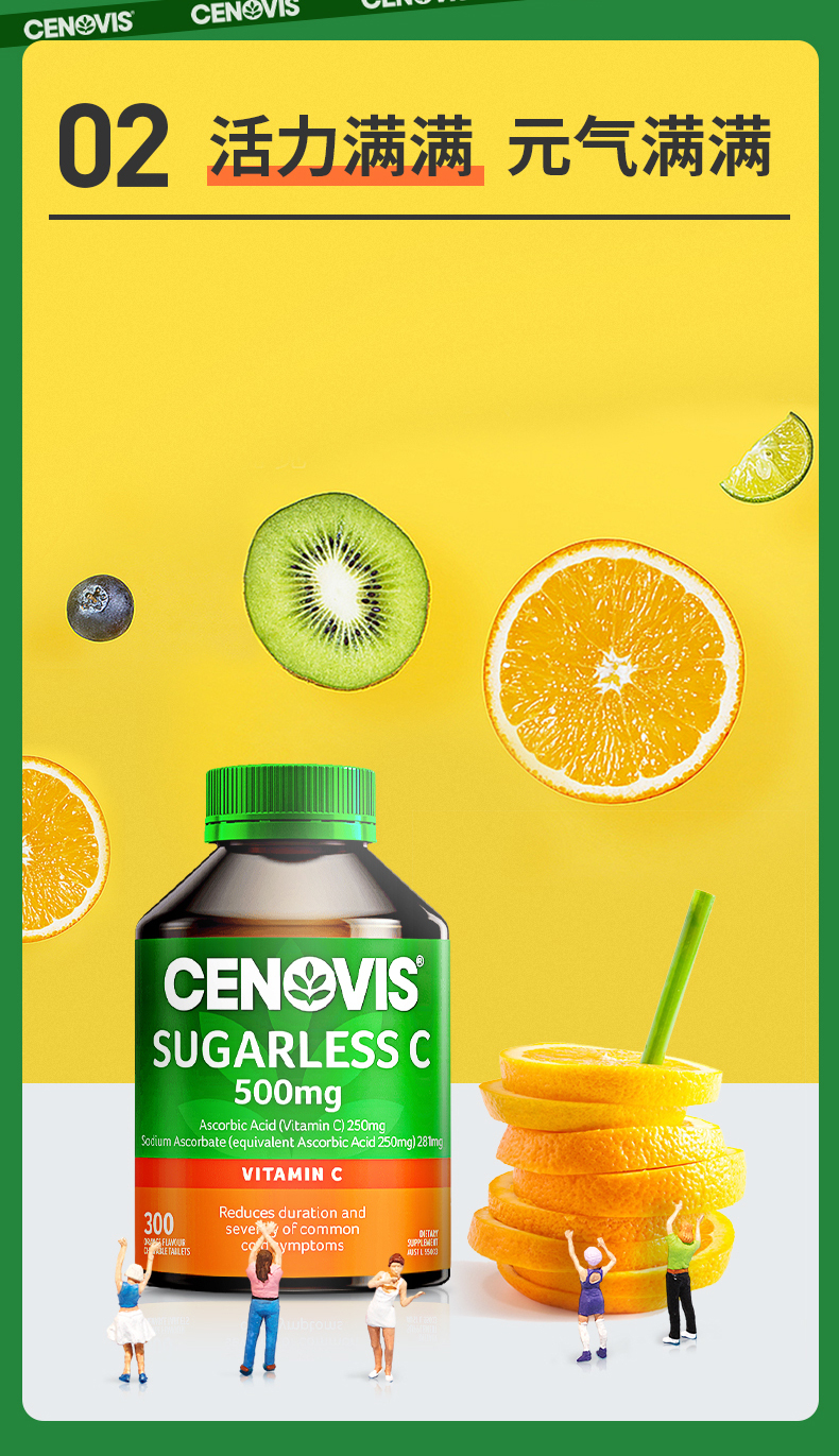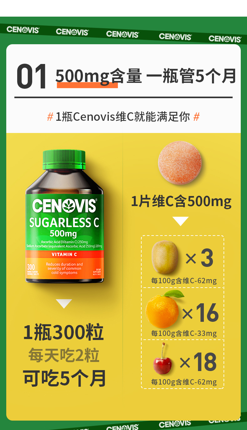 这款Cenovis维生素C咀嚼片,1000%澳洲原装进口,每片含维生素C 500mg(抗坏血酸250mg,抗坏血酸钠281mg),一片相当于20个橙子,天然橙味,酸酸甜甜的口感大家都爱吃,酸酸甜甜的口感大家都爱吃,特别是无糖配方的设计,连糖尿病人都可服用,一直服用也不担心会蛀牙或者发胖。