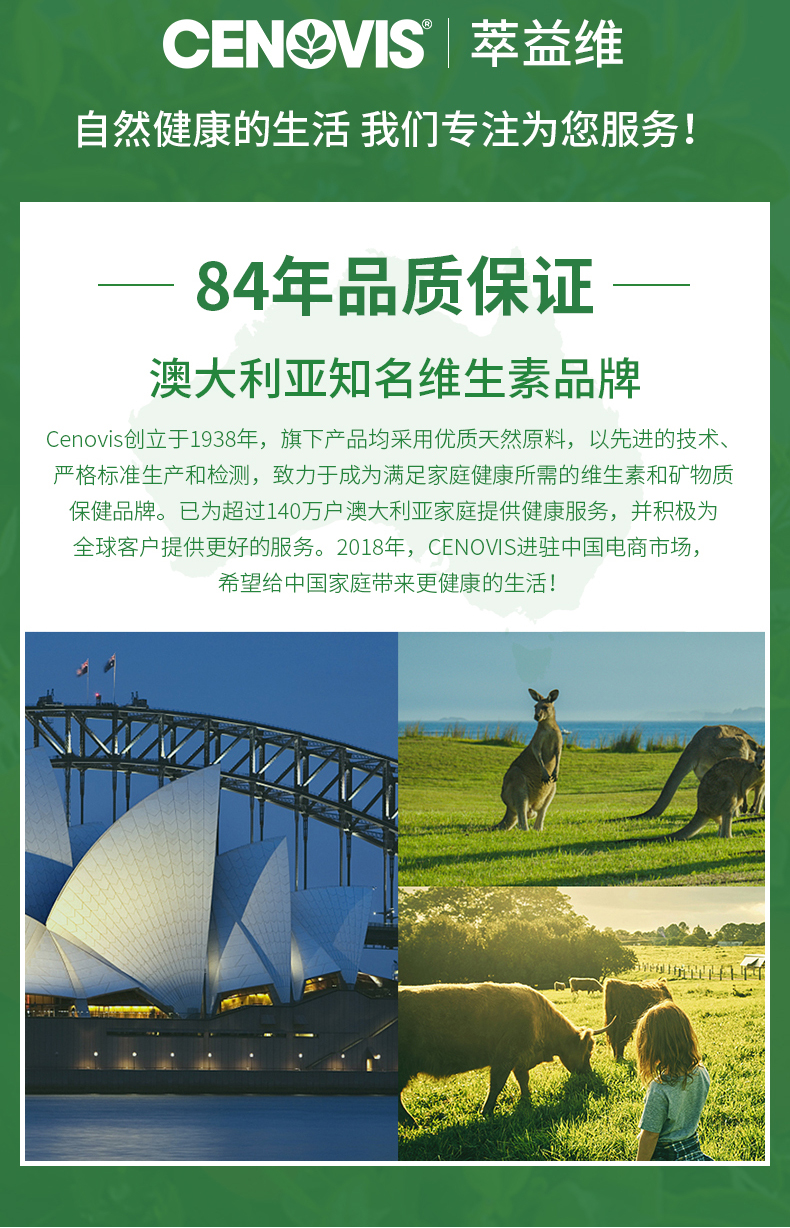 Cenovis是来自澳大利亚的知名保健品品牌,至今已有超过70年的历史,产品制造和测试,均以最高的质量标准完成。产品系列多达60多个品种,遍布澳洲各大药房和超级市场,远销世界多个国家。