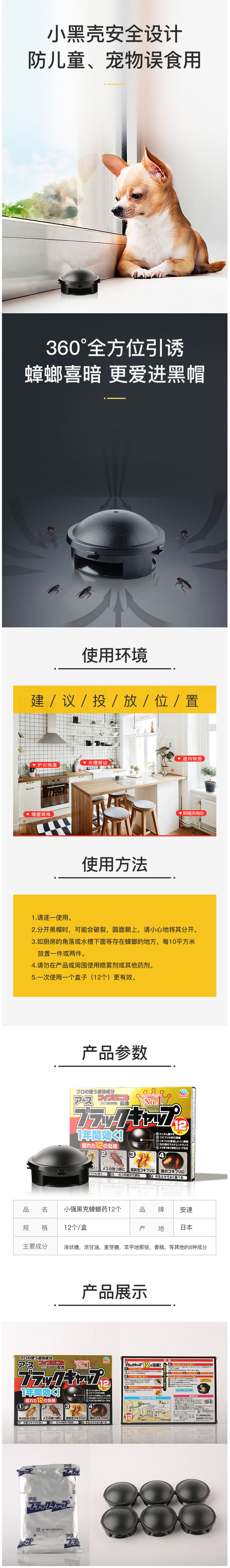 日本蟑螂药NO.1,药效持续1年,防触碰。“小黑帽”采用五种成分半生熟饵剂,安全无毒无害不含农药。强力引诱一只取食,然后携带病毒回窝传染连窝端,时效长达12个月,小黑屋设计,防止宝宝宠物误食,蟑螂喜暗更爱进,360度全方位引诱,各类蟑螂,全面消灭。