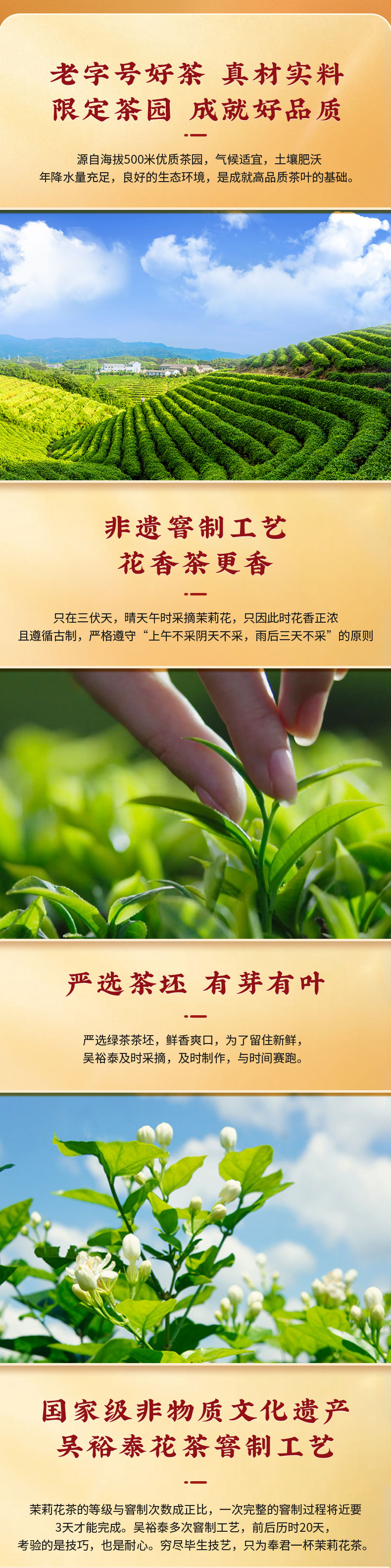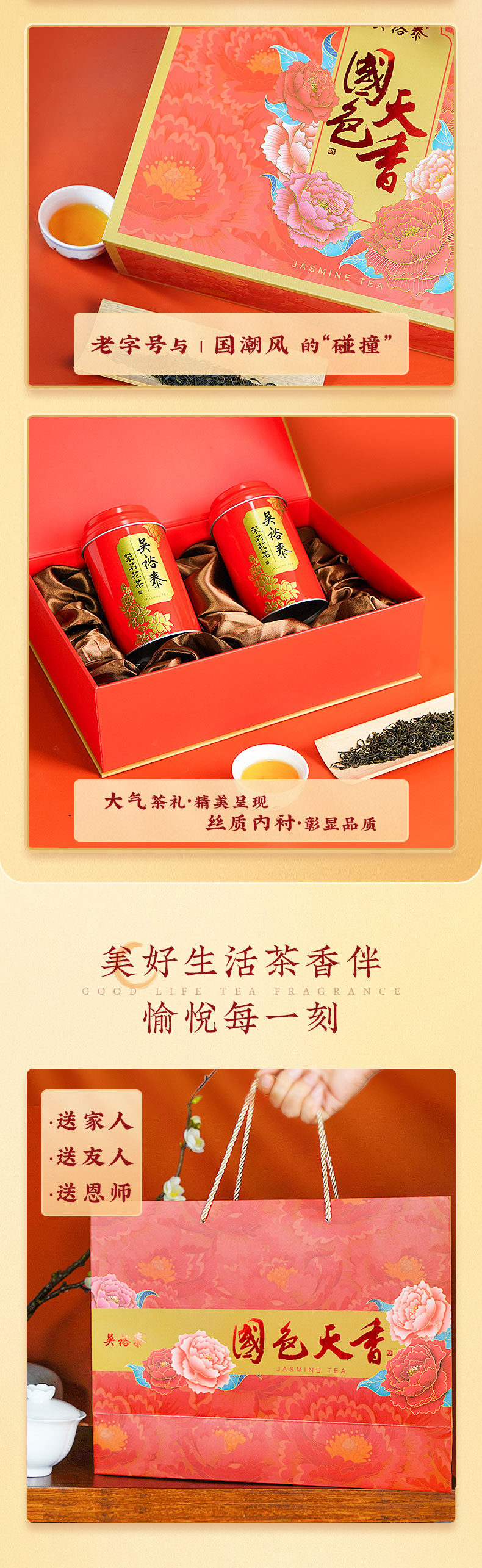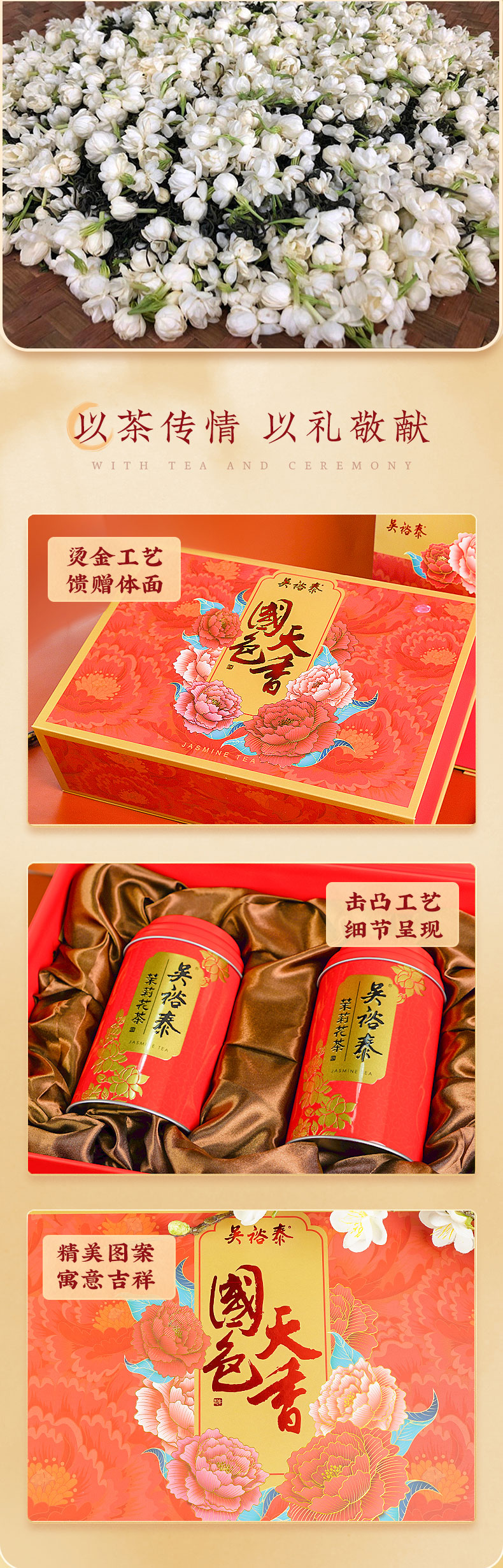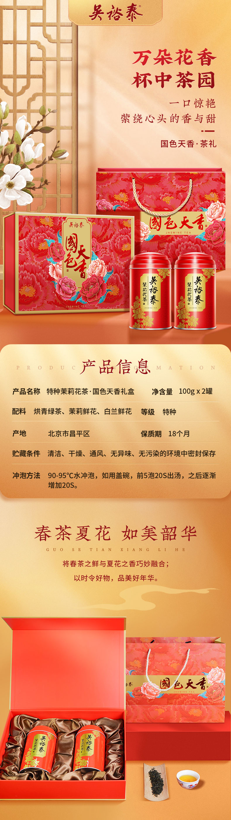 特种茉莉花茶·国色天香礼盒,限定茶园真实好料,国家级非物质文化遗产认证「吴裕泰花茶窨制工艺」,经过多次反复窨制,冲泡后汤色清澈明亮、花香四溢、宛如置身茉莉花海。精美国色天香礼盒过节送礼佳选。