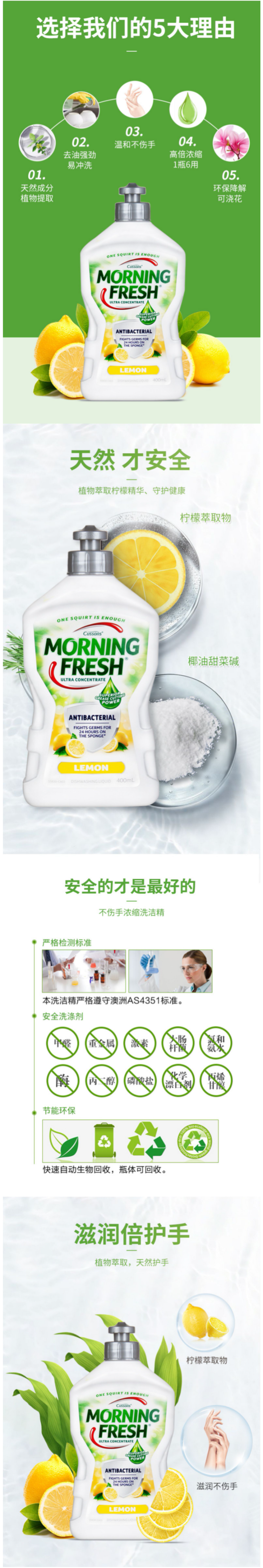 这款Morning Fresh 高浓缩洗洁精,采用无毒柔和的食品级天然配方,从天然植物中提取精华成分制成,去油污能力强,却不伤手。因为是浓缩的,所以每次只需轻轻挤出一滴就可以轻松洗去油污了。