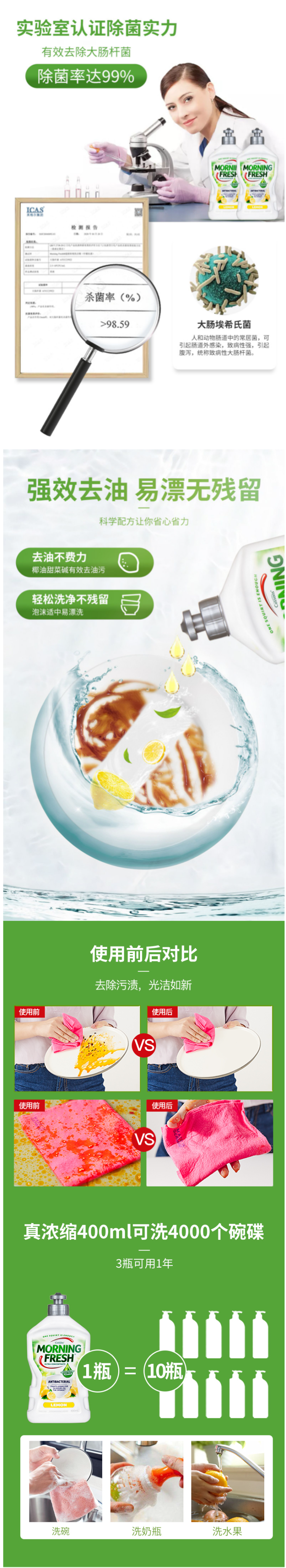 1瓶400ml的浓缩液大概可以洗4000个碗碟,除此之外,还可以洗去衣服上的油渍、地毯上的油污、玻璃上的污渍、水果蔬菜以及所有的厚重油污,甚至用于宝宝的奶瓶清洗,一瓶多用。