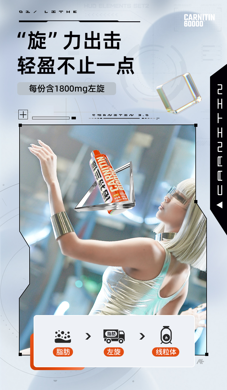 每10ml含有1200mg左旋肉碱,纯度高达99.99%,同时人体的吸收率也达99%,0糖分,0热量,0咖啡因。维生素B族协助脂肪在线粒体中分解燃烧;柑桔提取物能加速代谢,深层瓦解顽固部分,有效抑制食欲,预防能量过剩。