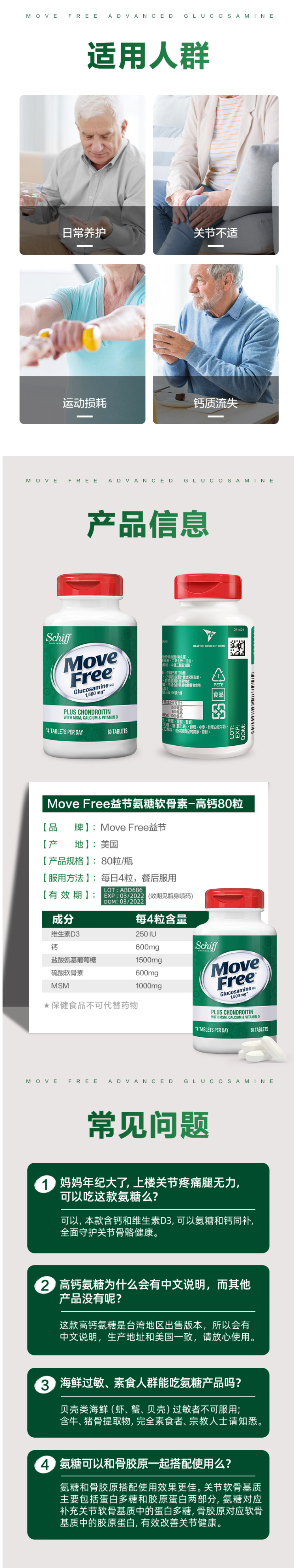 Move Free系列中除了大家熟悉的红、绿、蓝三种普通款,还有Move Free Ultra白瓶加强款和高钙氨糖款。