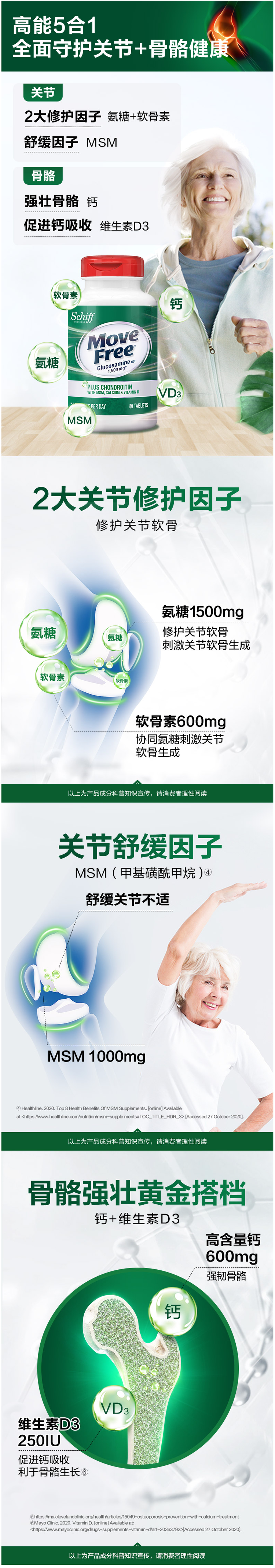 今天推荐的是MoveFree 高钙氨糖软骨素,是高含量氨糖+钙的组合,1瓶双补充。作用于全身关节,催生关节滑液,缓解疼痛感,促进软骨生长,持续养护延缓关节老化。还特别添加了MSM止痛成分,减少了关节的疼痛,预防感染、加速愈合。
