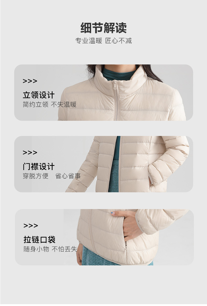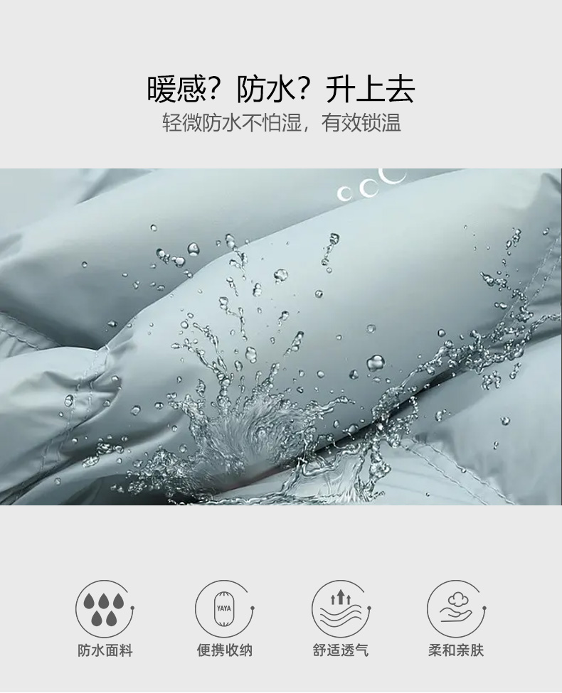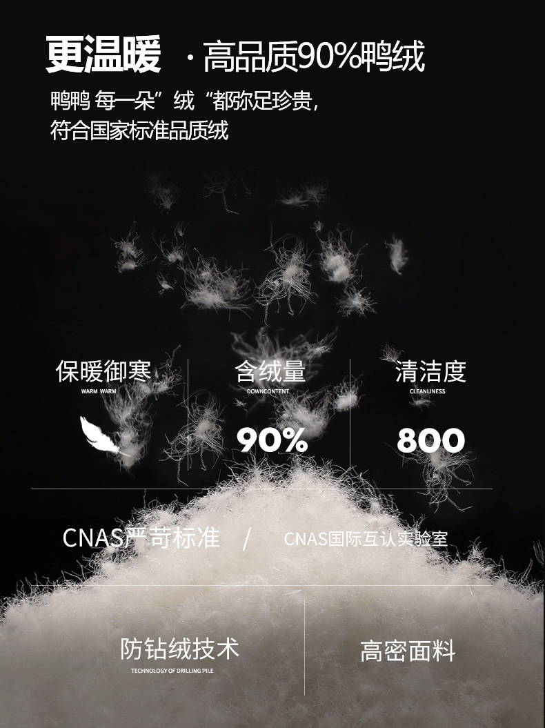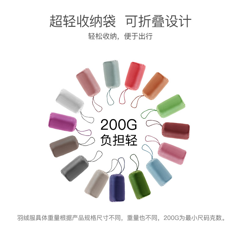 甄选优质白鸭绒填充,含绒量90%,蓬松度高,保暖性佳,800+清洁度,清洁无异味,外层尼龙面料,高支高密防泼水、结实防磨耐刮,分格充绒技术,有效防止钻绒,且防污防水易清洗;赠送轻薄收纳袋,体积小巧外出便携。