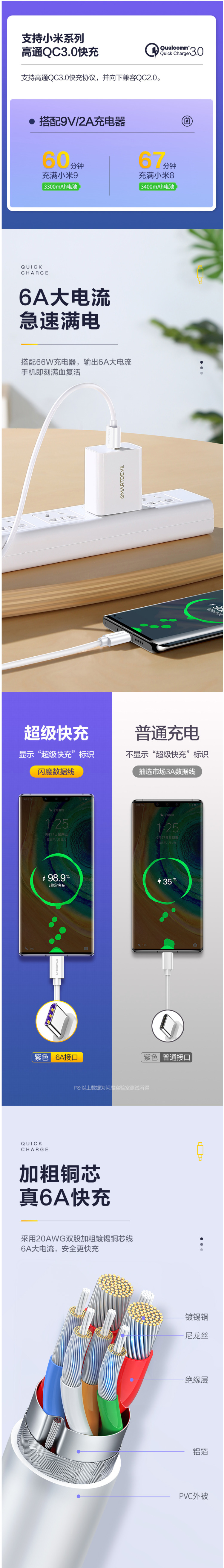 采用加粗镀锡铜线芯,充电传输二合一,正反都可插。支持小米系列高通QC3.0快充协议,并向下兼容QC2.0。内置电阻,稳定识别快充设备,涓流充电防止电流过载。升级PVC一体固线接头,告别接口破损开裂风险。